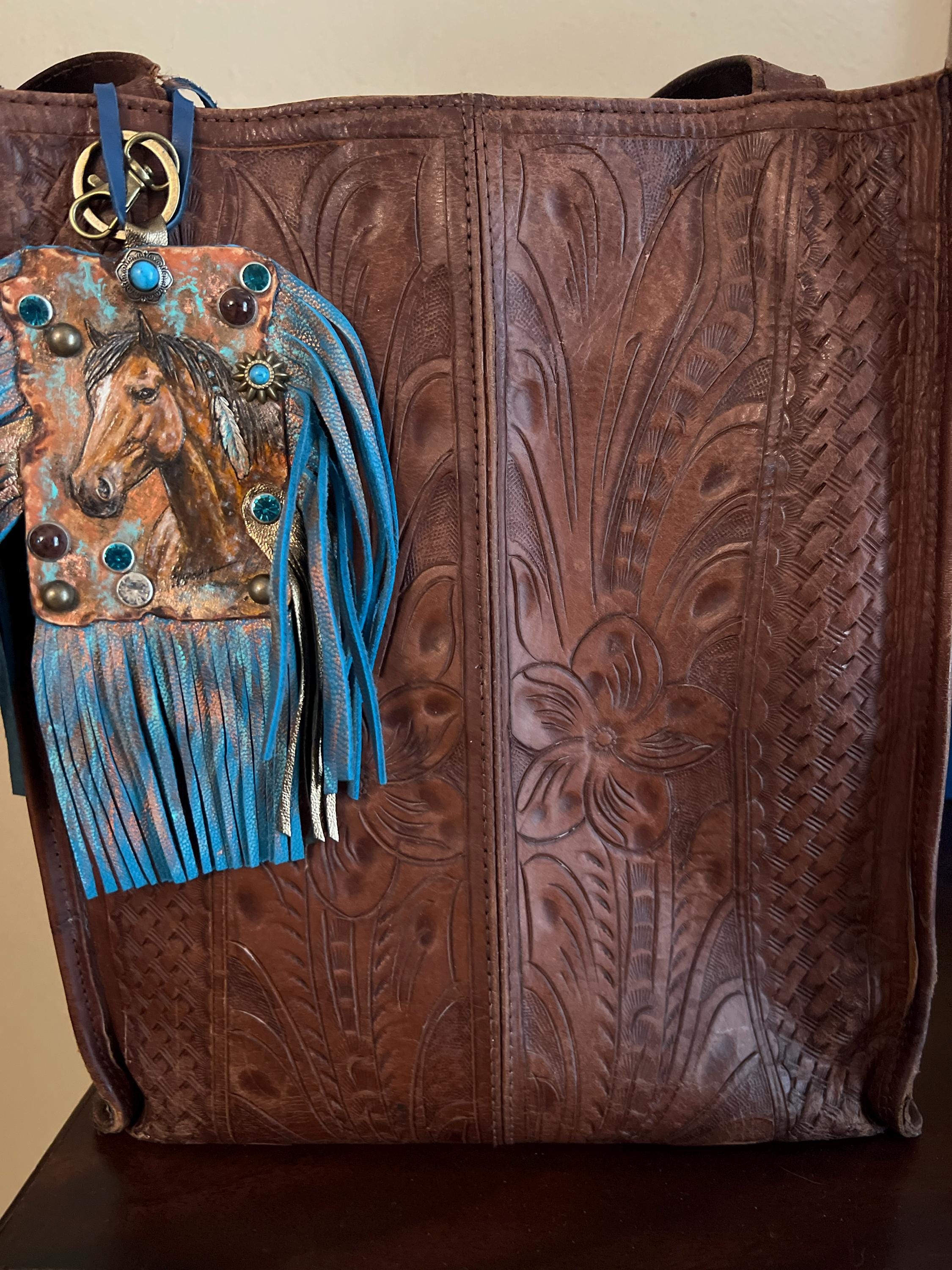 Ready to ship, this original art was inspired by playing cards and is crafted from genuine leather, cut to be 3.5" x 2.5", with painted acrylic art, assorted metal gemstone and rhinestones bling embellishments, and heat branded edges for a rustic burned effect, attached to soft goatskin hand cut fring. Size fring included is 6” long x 5” wide. Stunning art accent to hang on your bag, from mirror, hang anywhere!