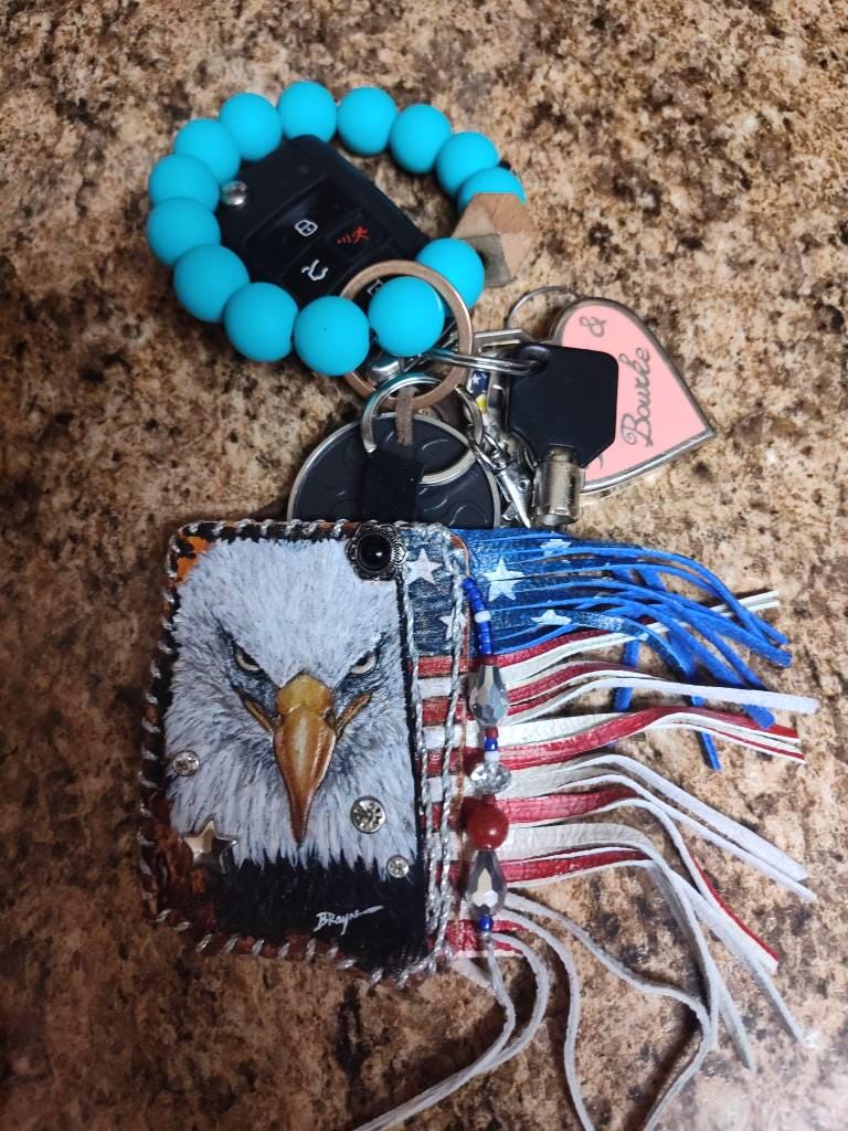 Fine Eagle art leather blinged playing card fringed bag hanging charm