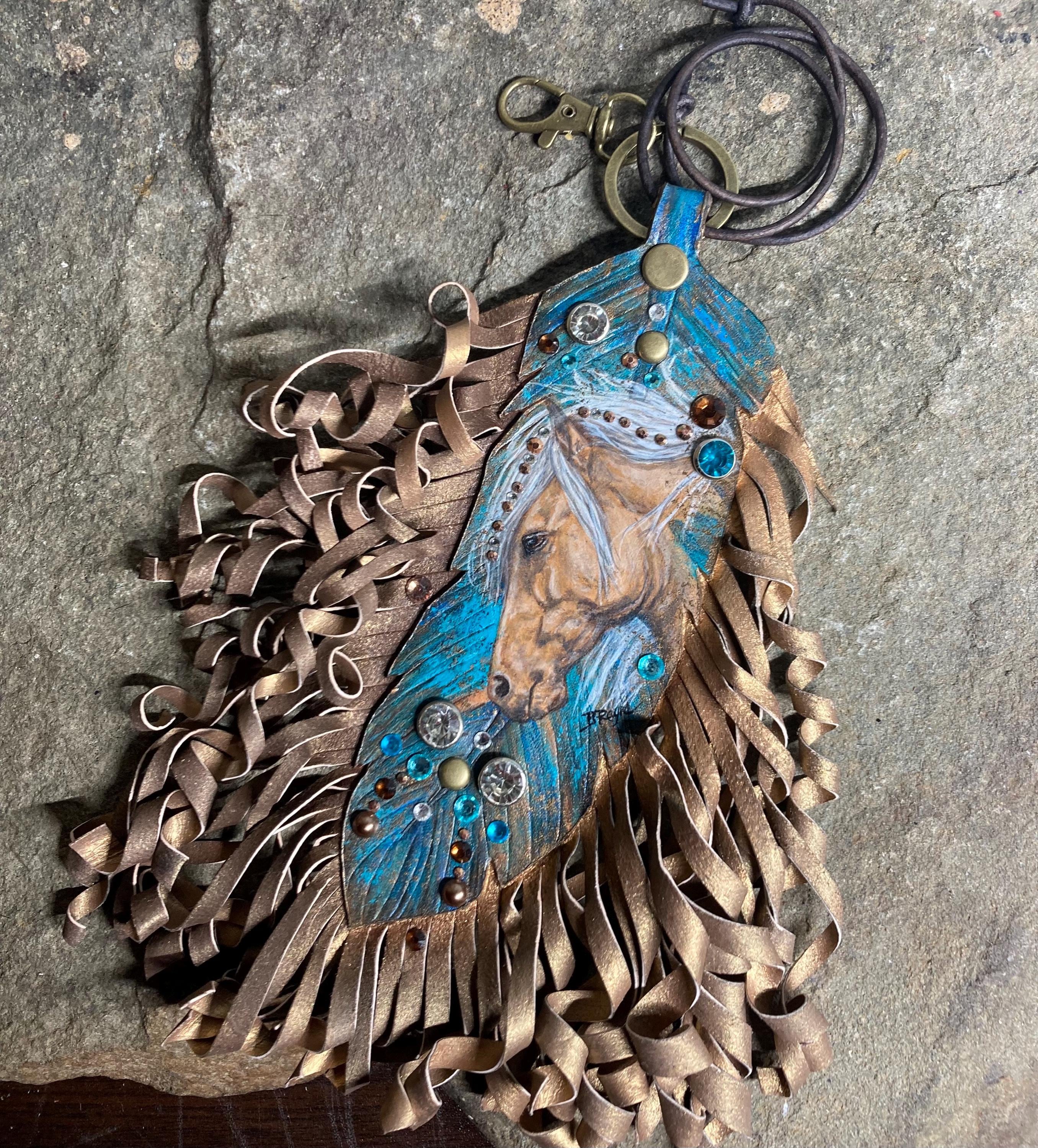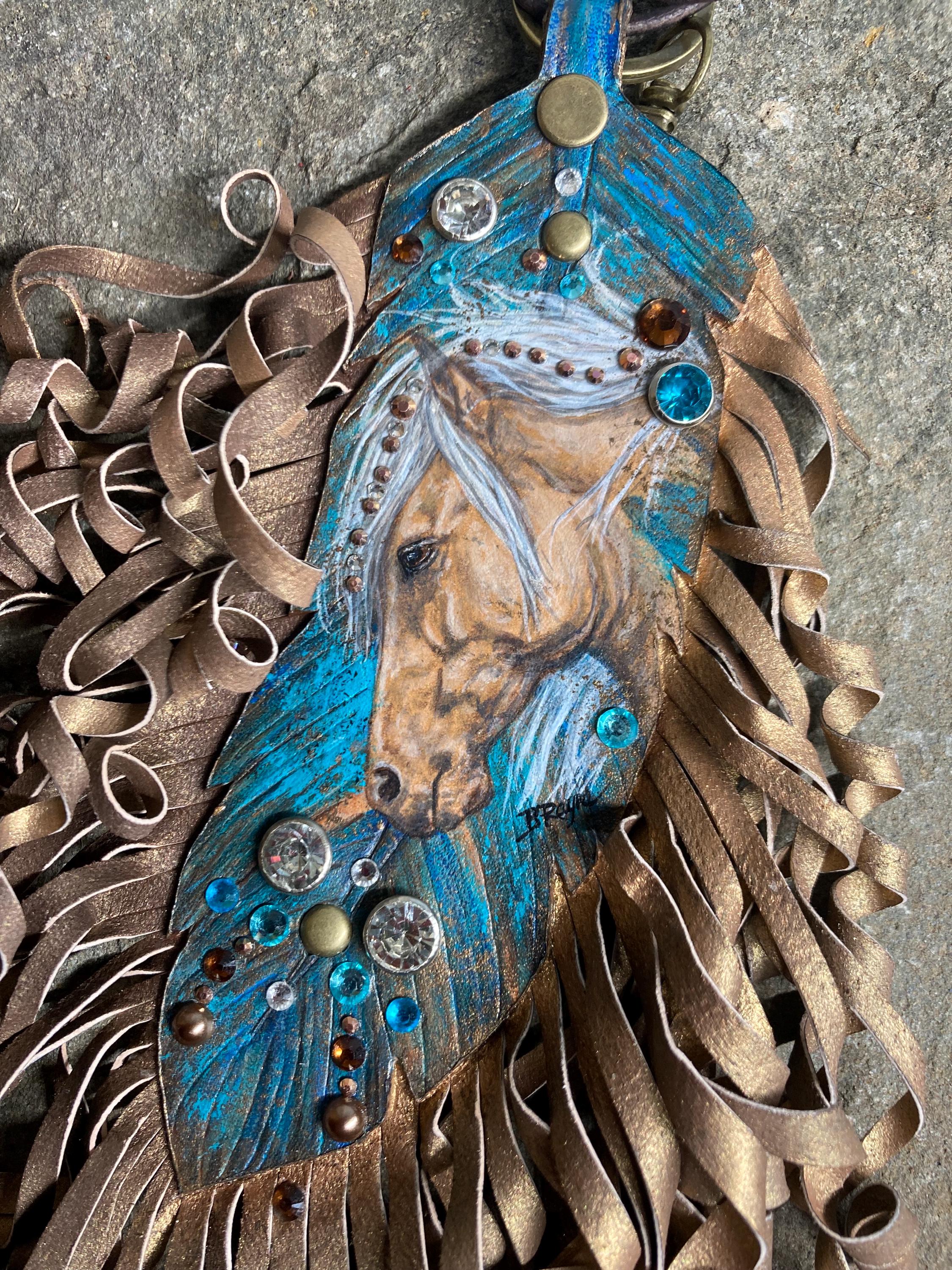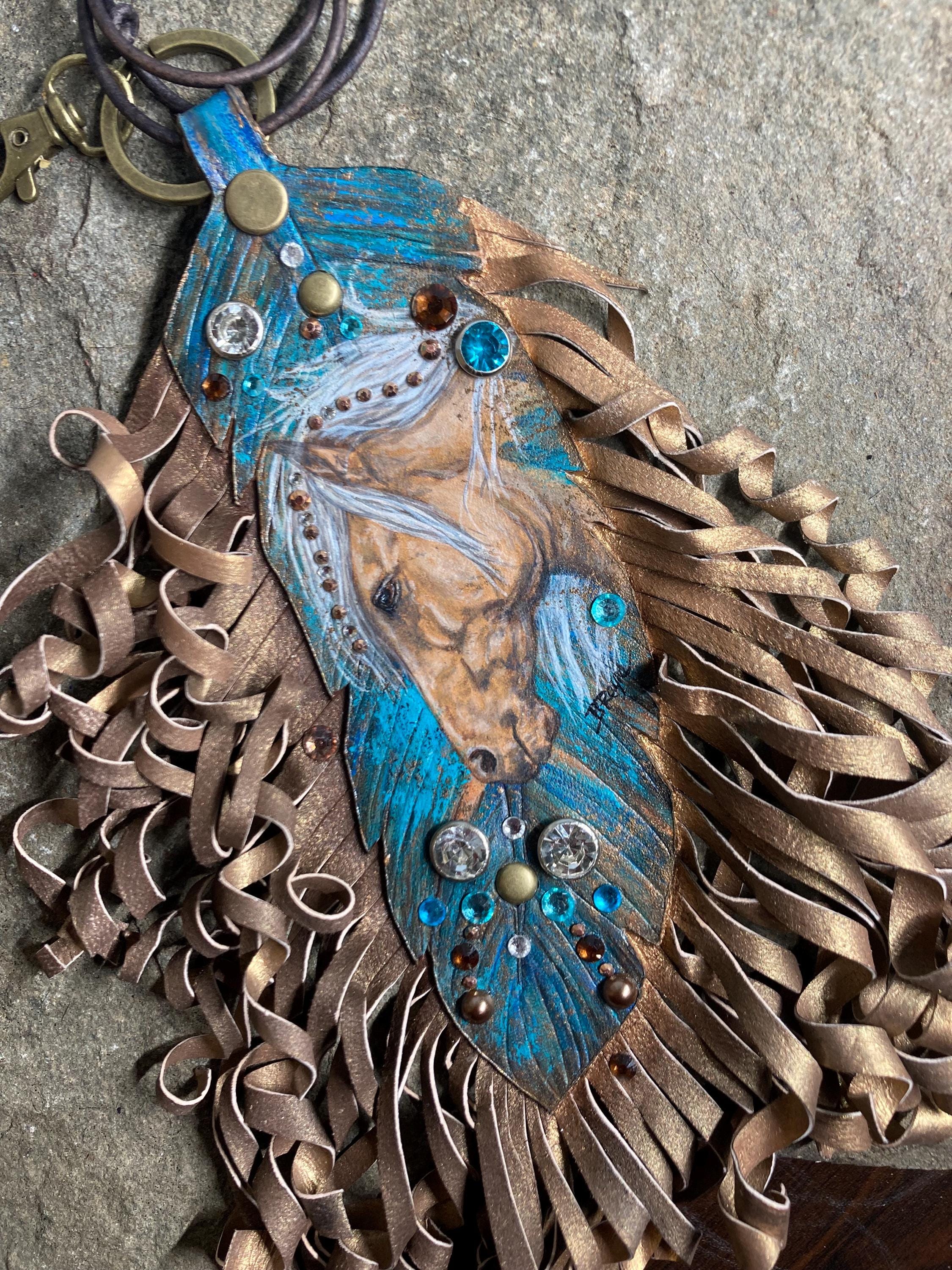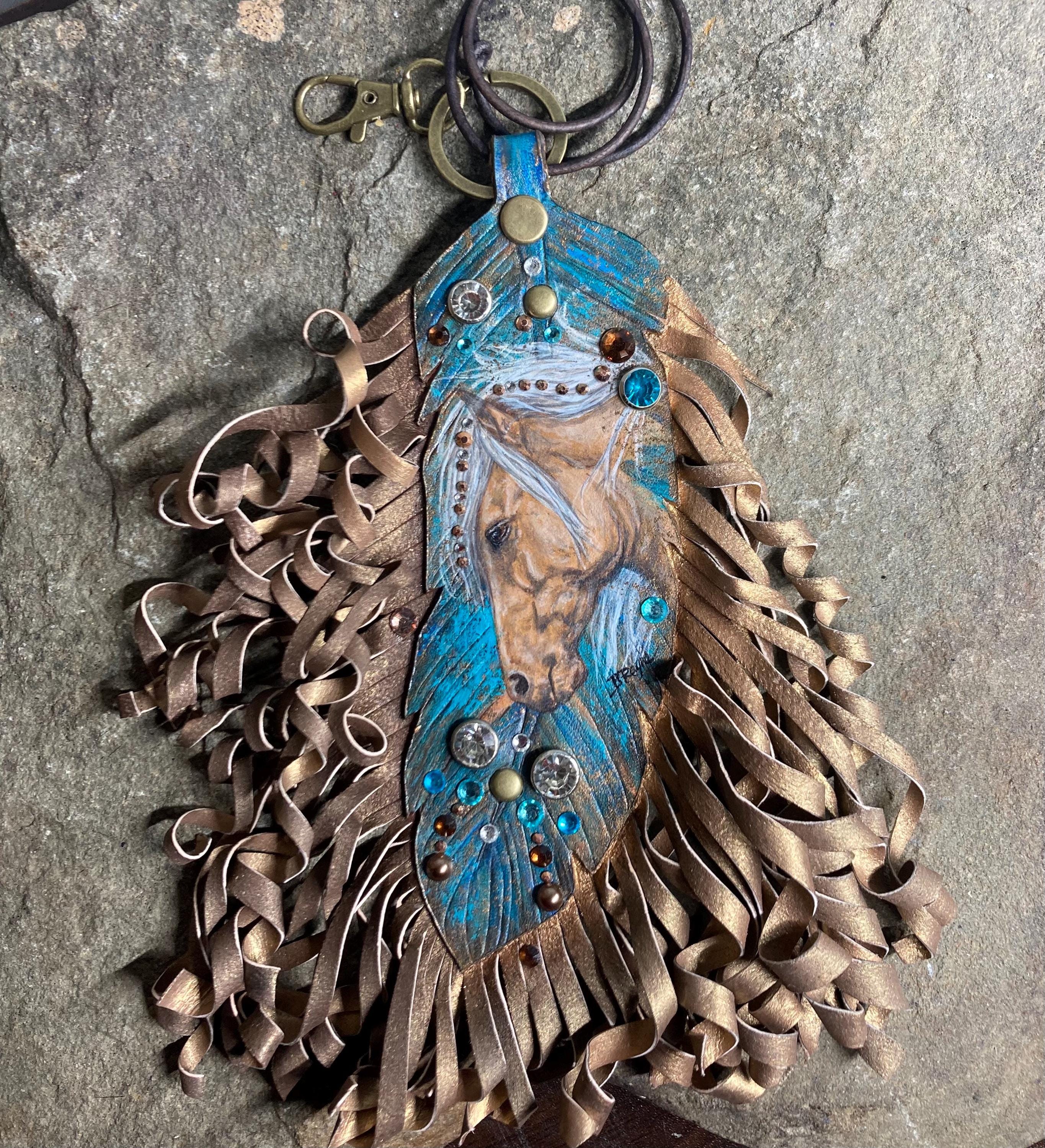 Ready to ship painted palomino horse art on leather feather / western leather bag embellishment / rhinestones and leather cowgirl bling