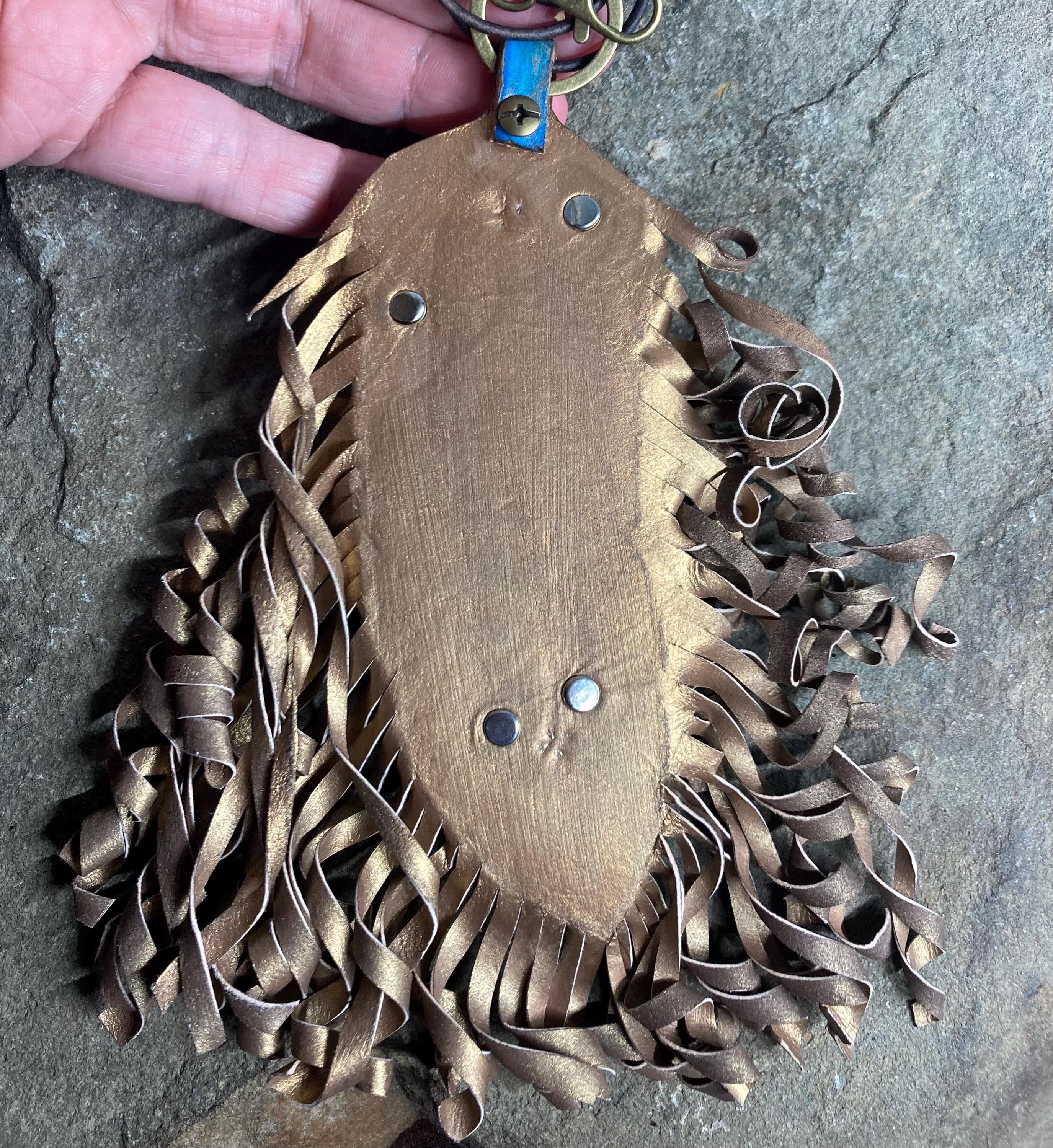 Beautiful western leather feather with lots of curly fringe to hang on your bag, from a mirror, use as a keychain. This one of a kind piece of sparkling fine art is a genuine leather hand cut and painted feather with sparkling rhinestones and metal rivet embellishments and bronze curly fringe. 7” long from loop at top to bottom of fringe. Edges of feather are heat branded and sealed, back is shimmering bronze leather. Comes with the pictured key ring and swivel snap.