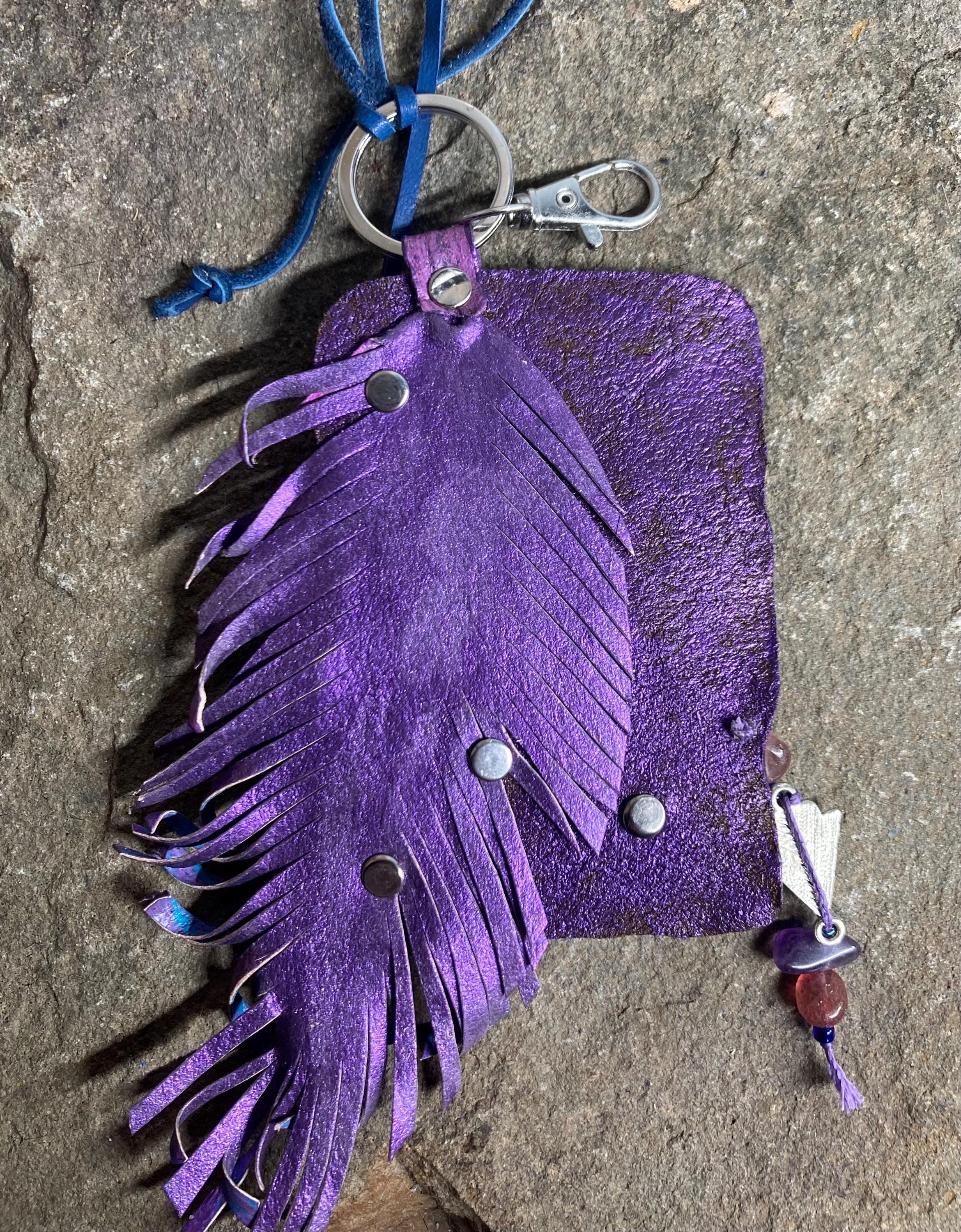 Beautiful vibrant colors western leather charm to hang on your bag, from a mirror, use as a keychain. This one of a kind piece of sparkling fine art is genuine leather hand cut and painted with sparkling rhinestones and metal rivet embellishments and curly leather fringe feather design. 5.5” long from loop at top to bottom of fringe. Edges are heat branded and sealed, back is shimmering purple leather. Comes with the pictured key ring and swivel snap.