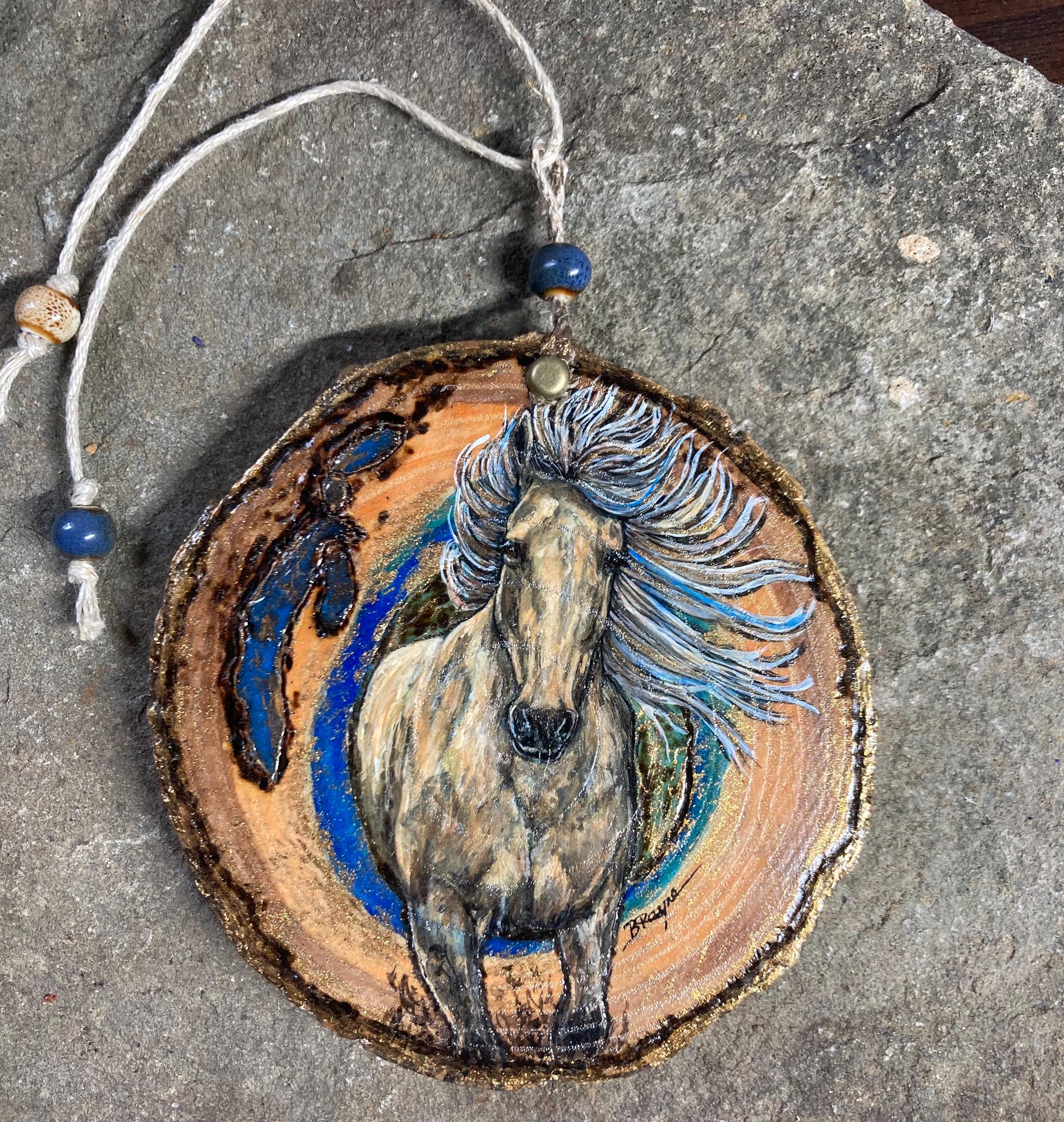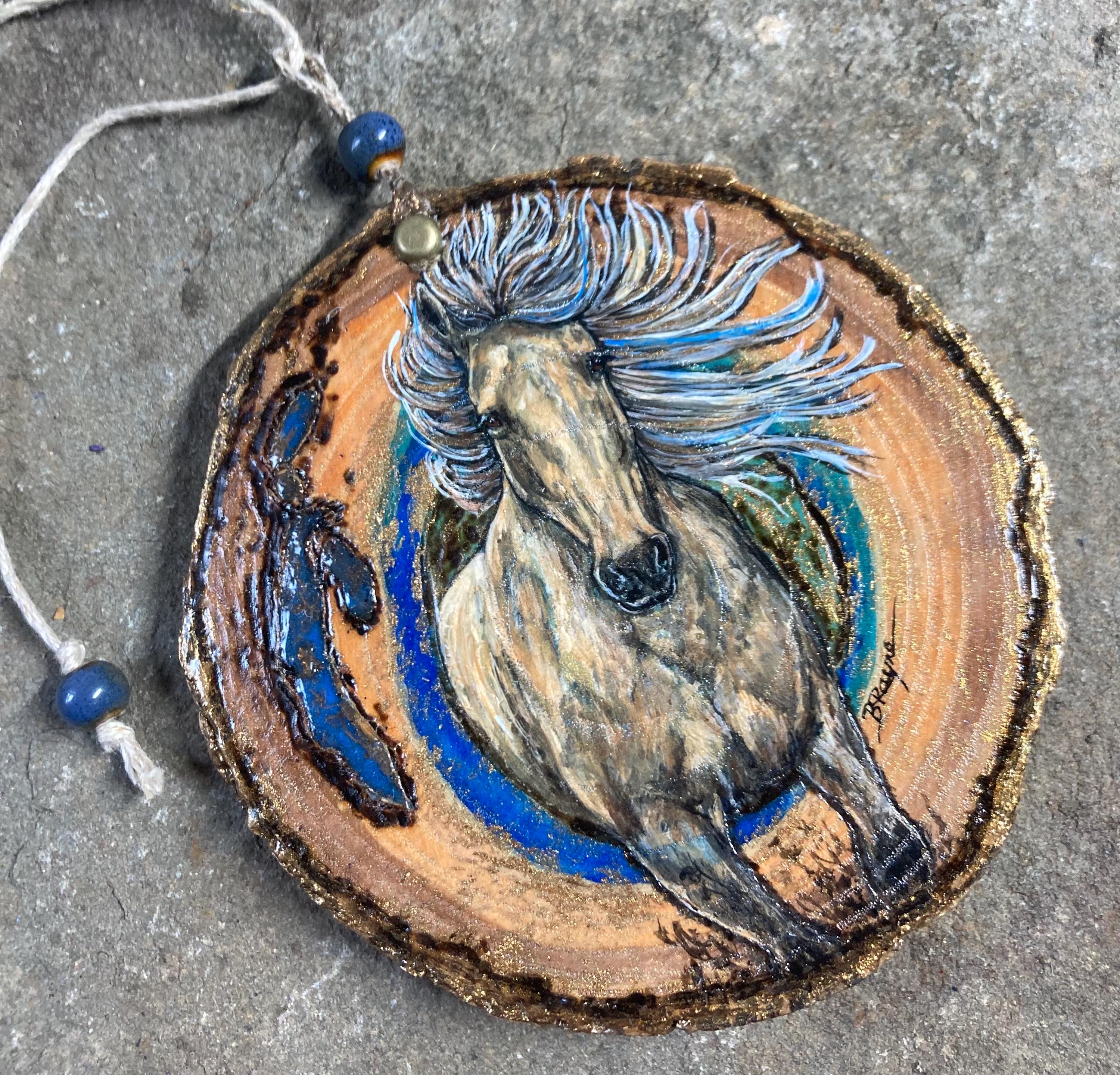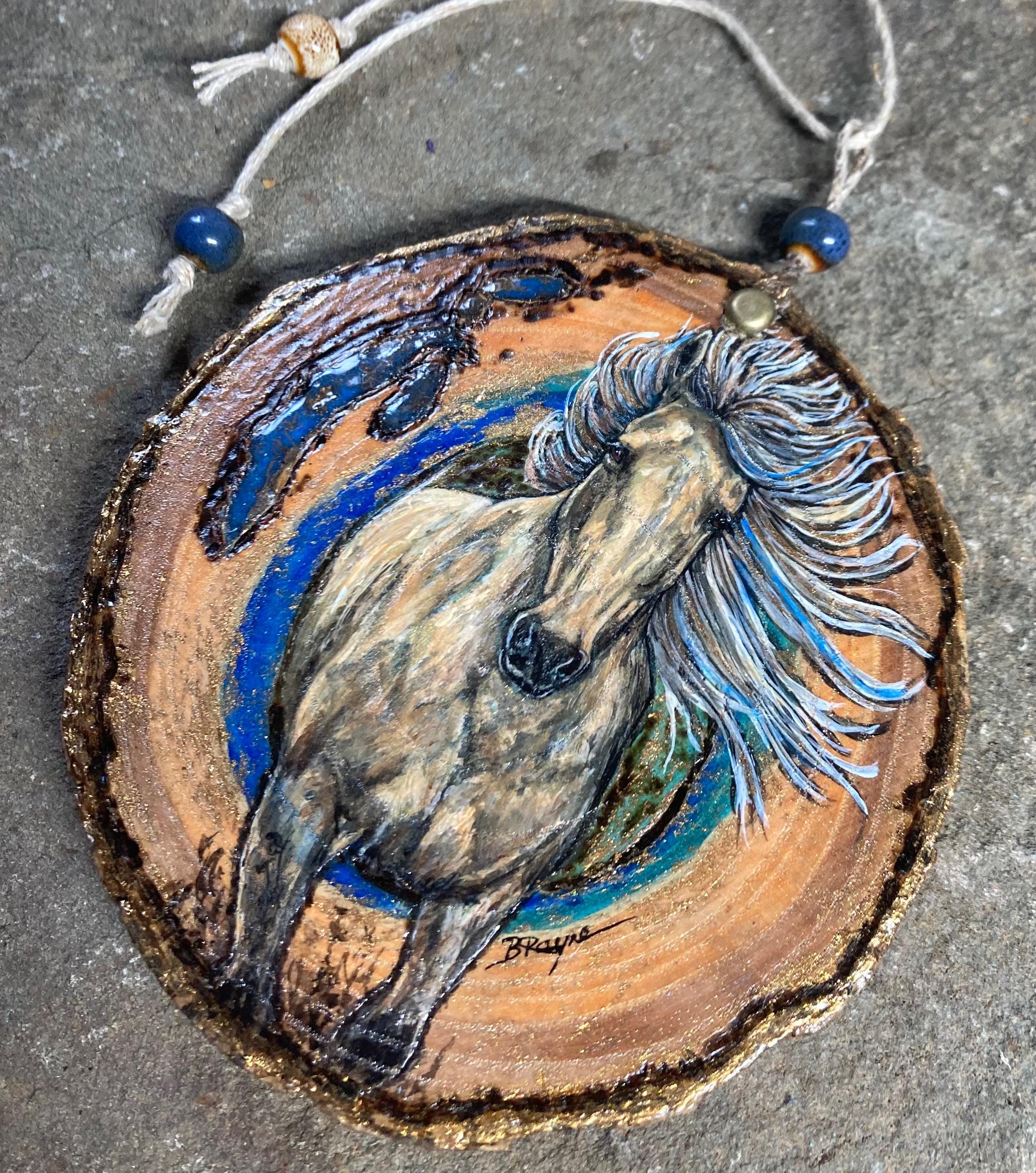 Ready to ship wood slice with blue and bronze resin inlay and painted origional horse art ornament / hanging equestrian western decor. Measures 4” and 3/8” thick.