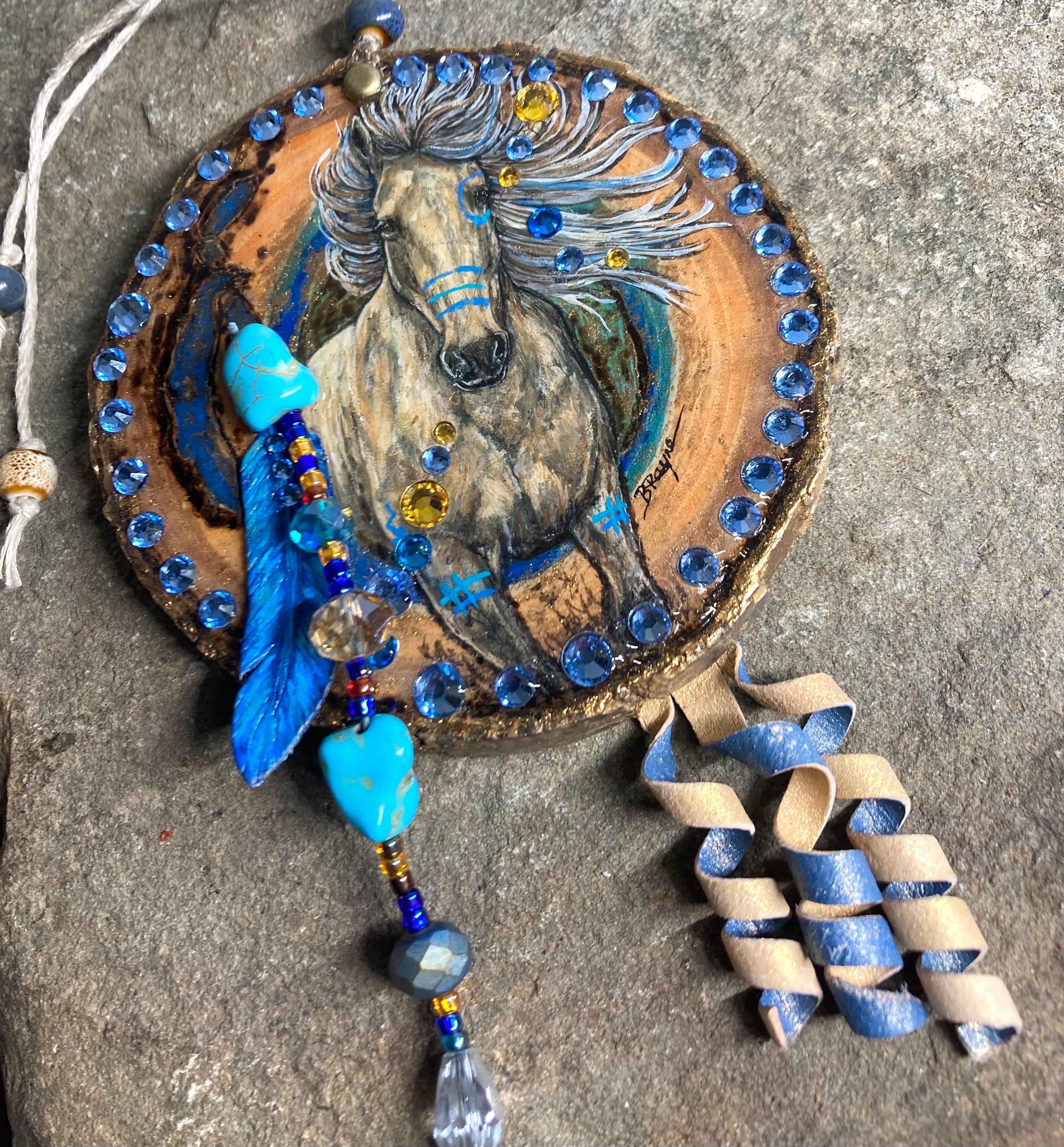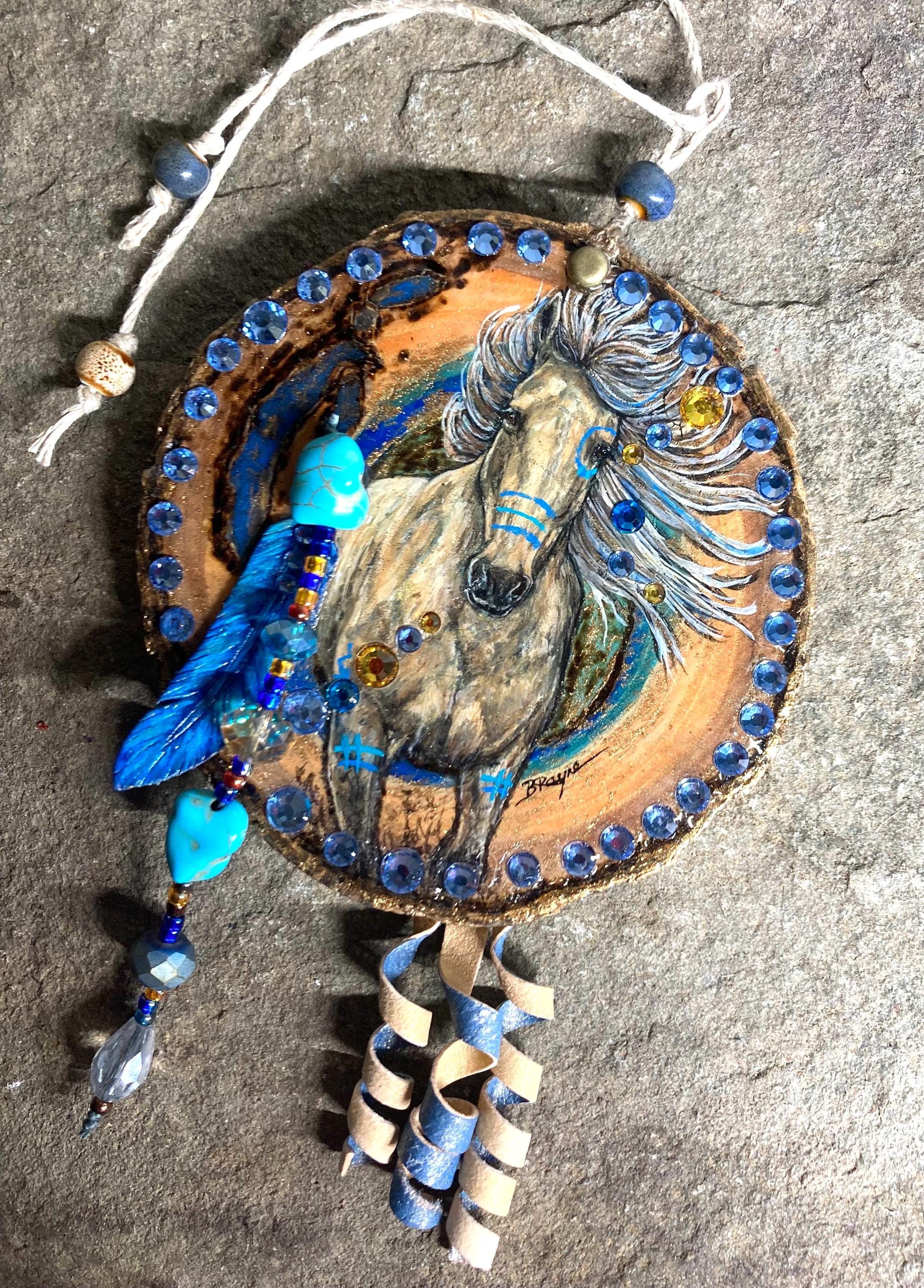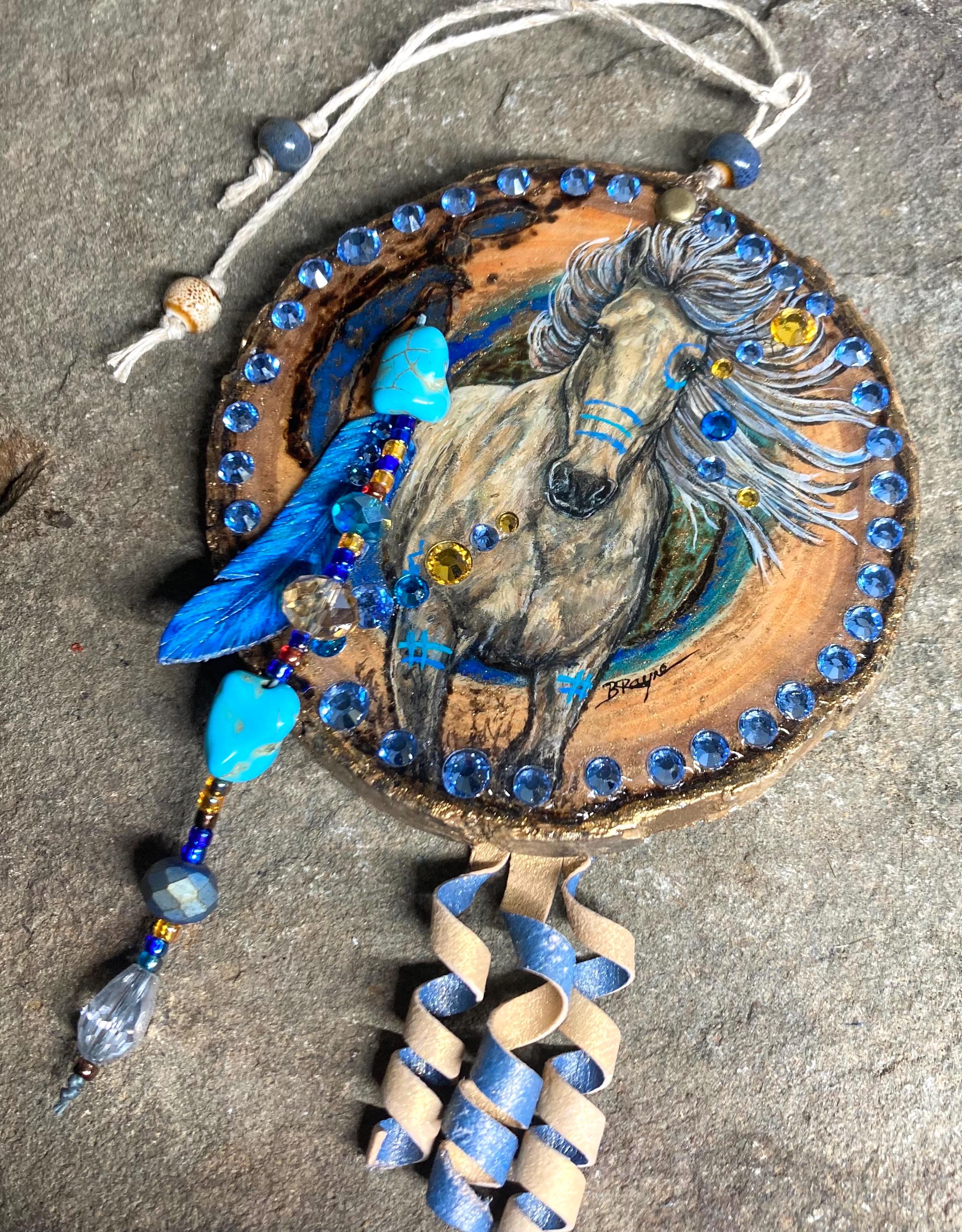 Ready to ship wood slice with blue and bronze resin inlay and painted origional horse art ornament / hanging equestrian western decor. Embellished with crystal rhinestones and glass beads and back is leather with curly leather fringe. Front sealed with resin. Measures 6” long and 3/8” thick.