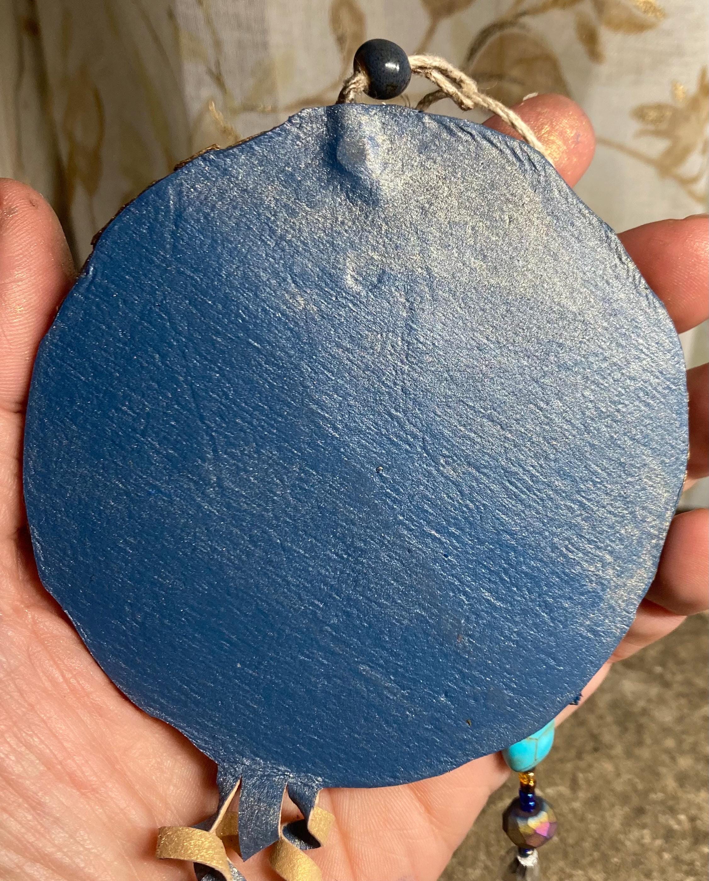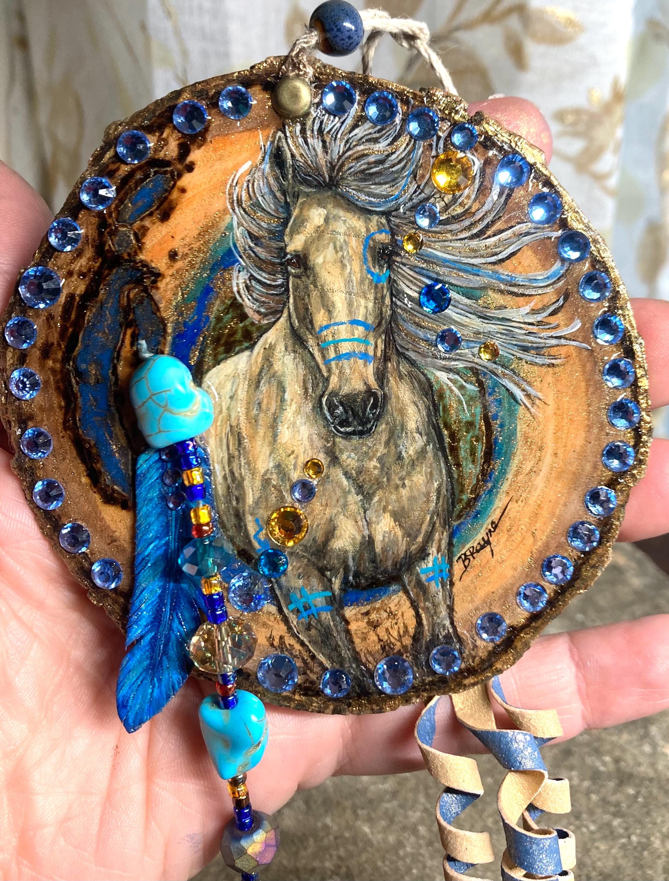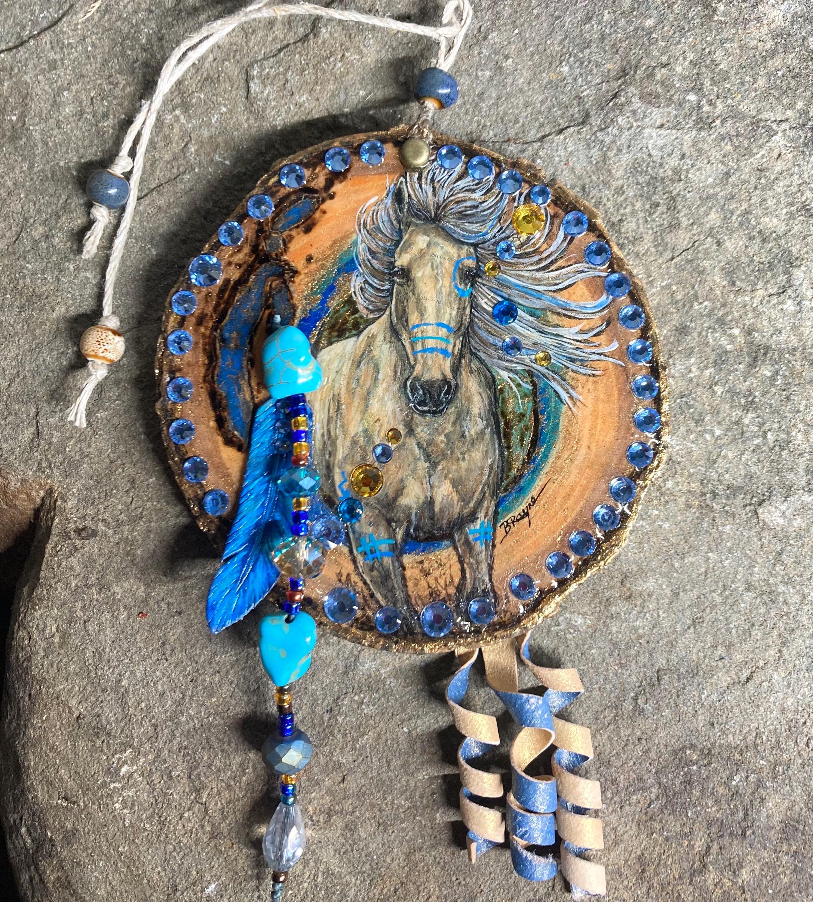 Ready to ship wood slice with blue and bronze resin inlay and painted origional horse art ornament / hanging equestrian western decor. Embellished with crystal rhinestones and glass beads and back is leather with curly leather fringe. Front sealed with resin. Measures 6” long and 3/8” thick.