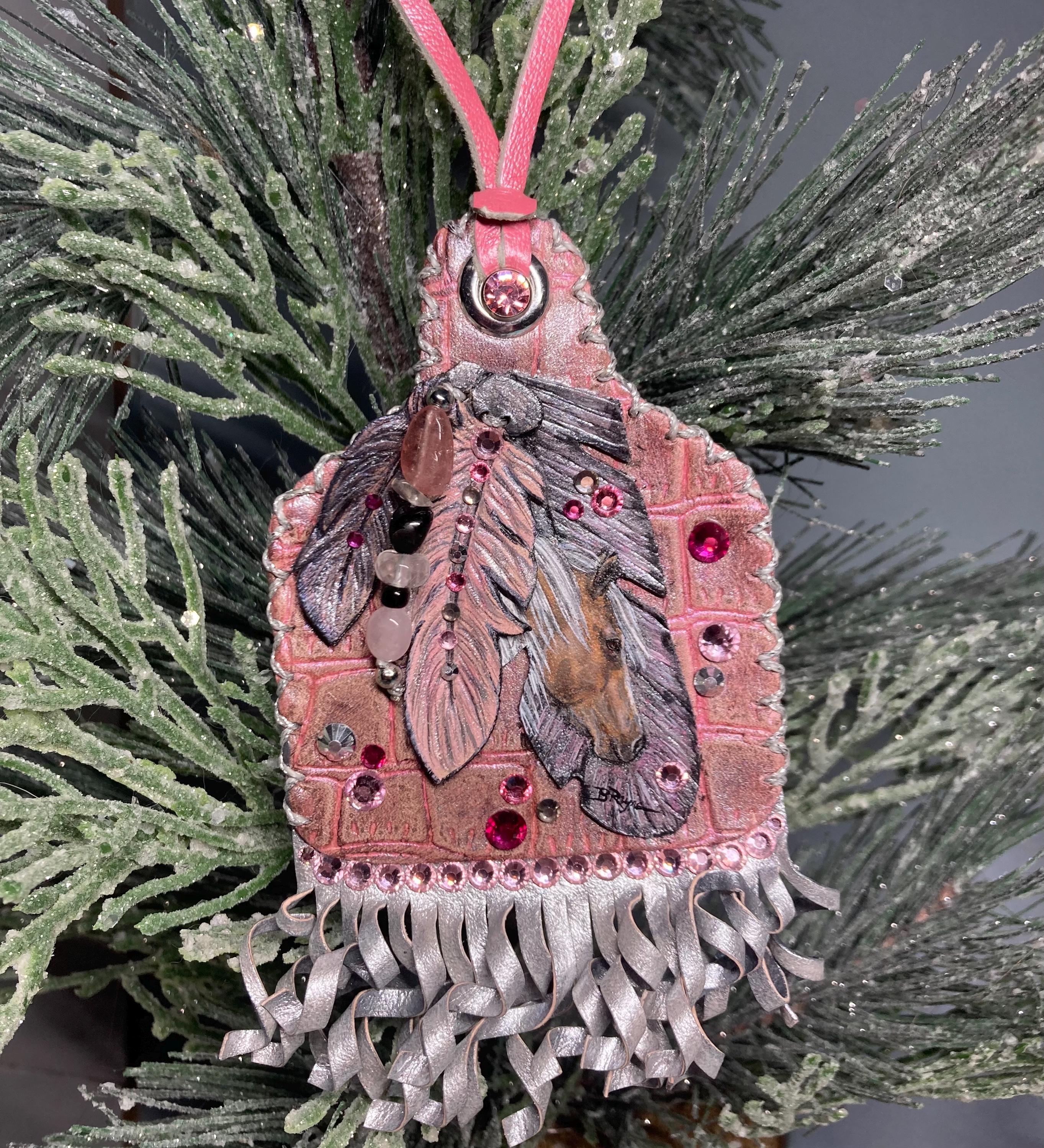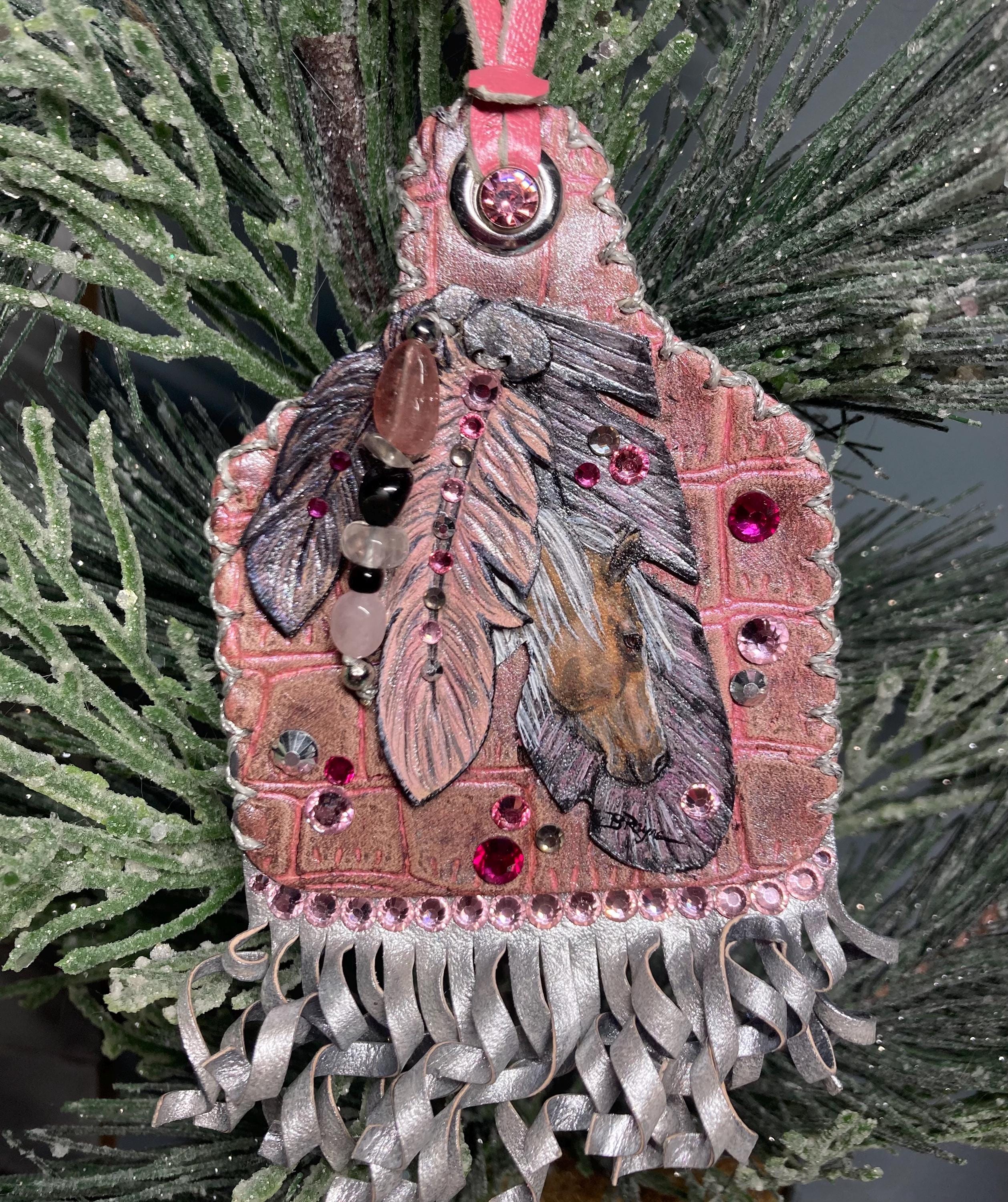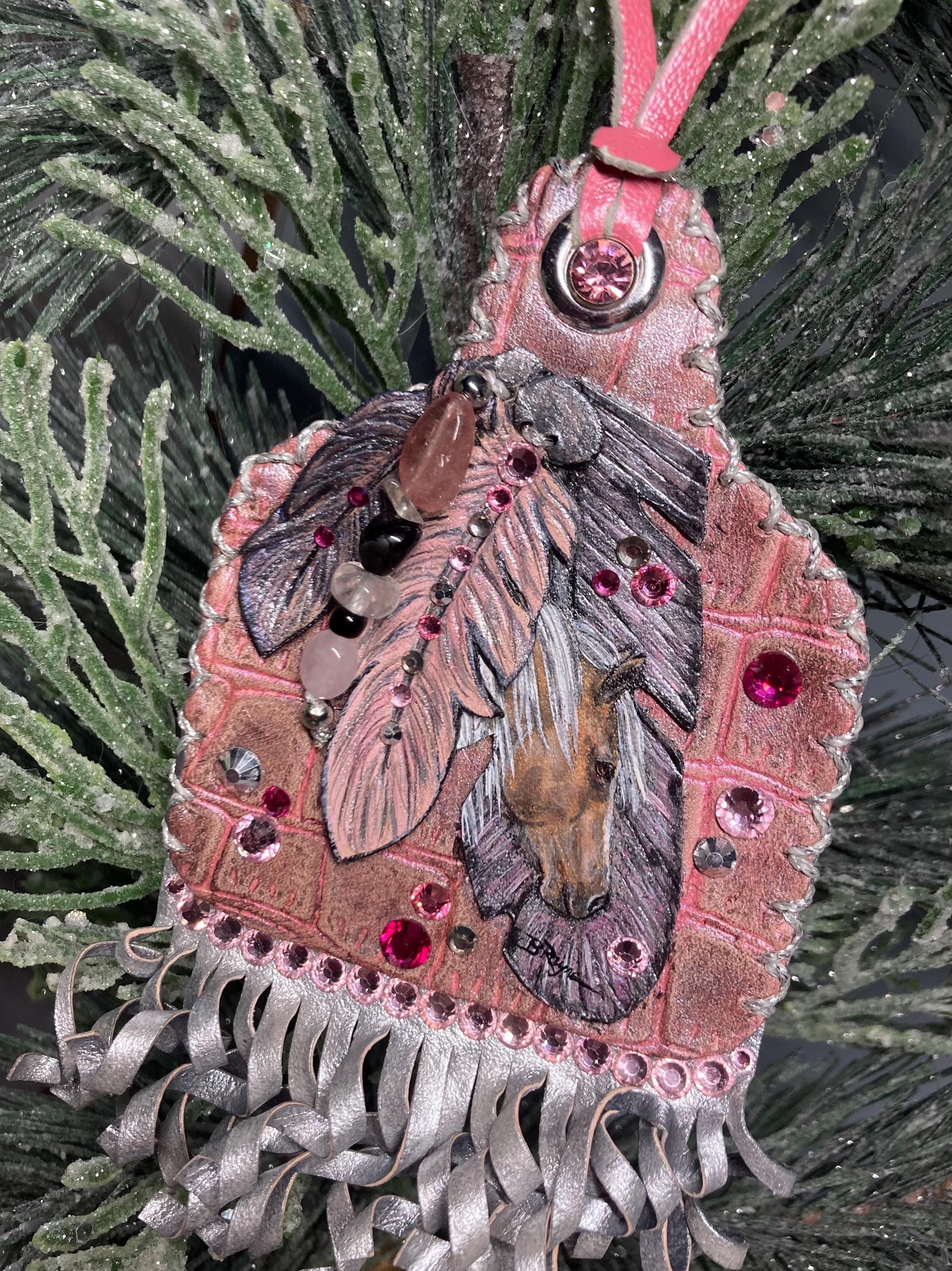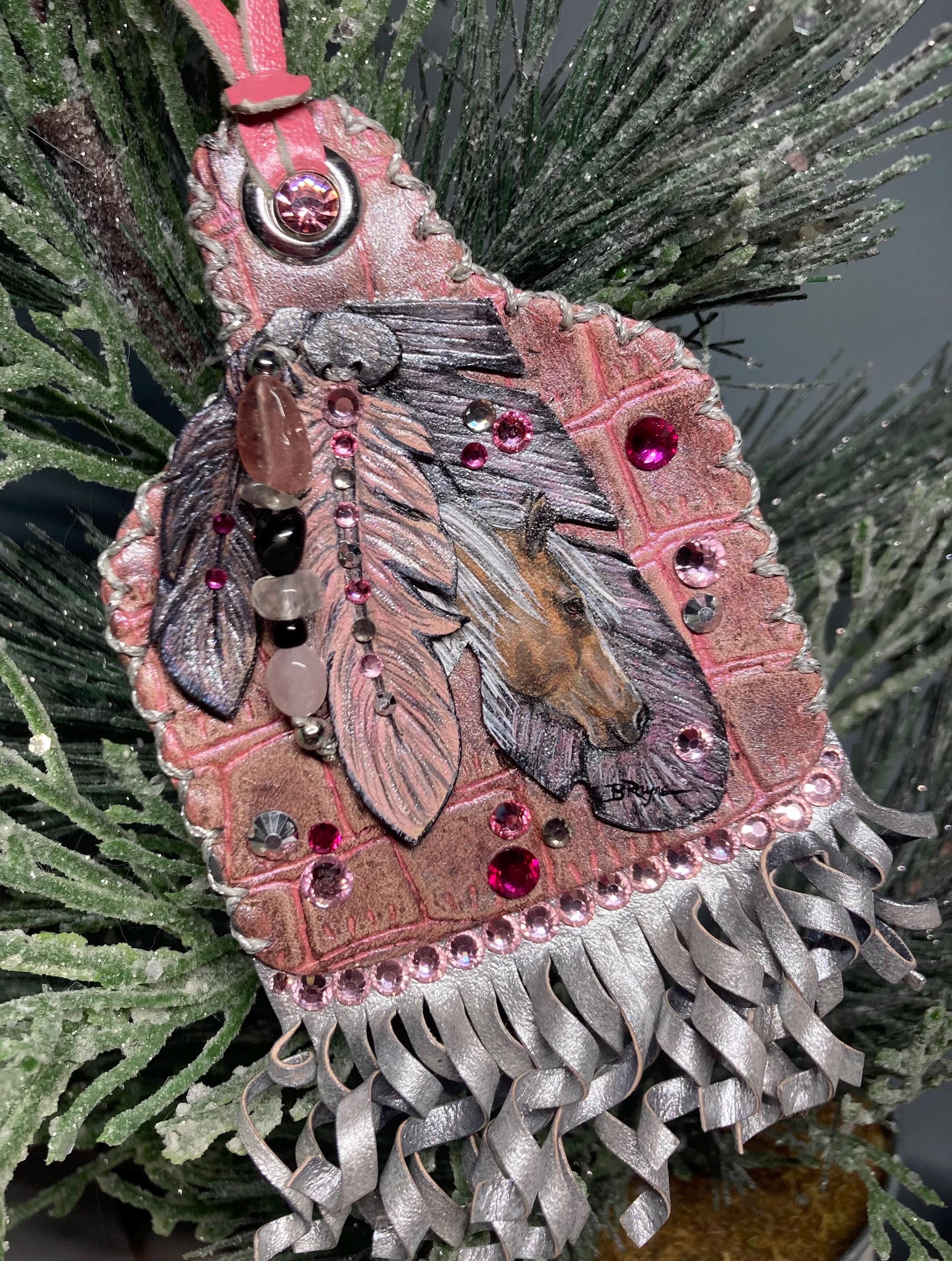 This one of a kind hand cut, tooled and painted horse art and painted leather feathers design genuine thick leather charm / ornament measures 5.5" x 3." and comes with a genuine leather cord to attach by tying. Silver back and curly leather fringe, sparkling glass rhinestones bling and real gemstones dangle embellishments. Would reflect lights beautifully hanging on Christmas tree!