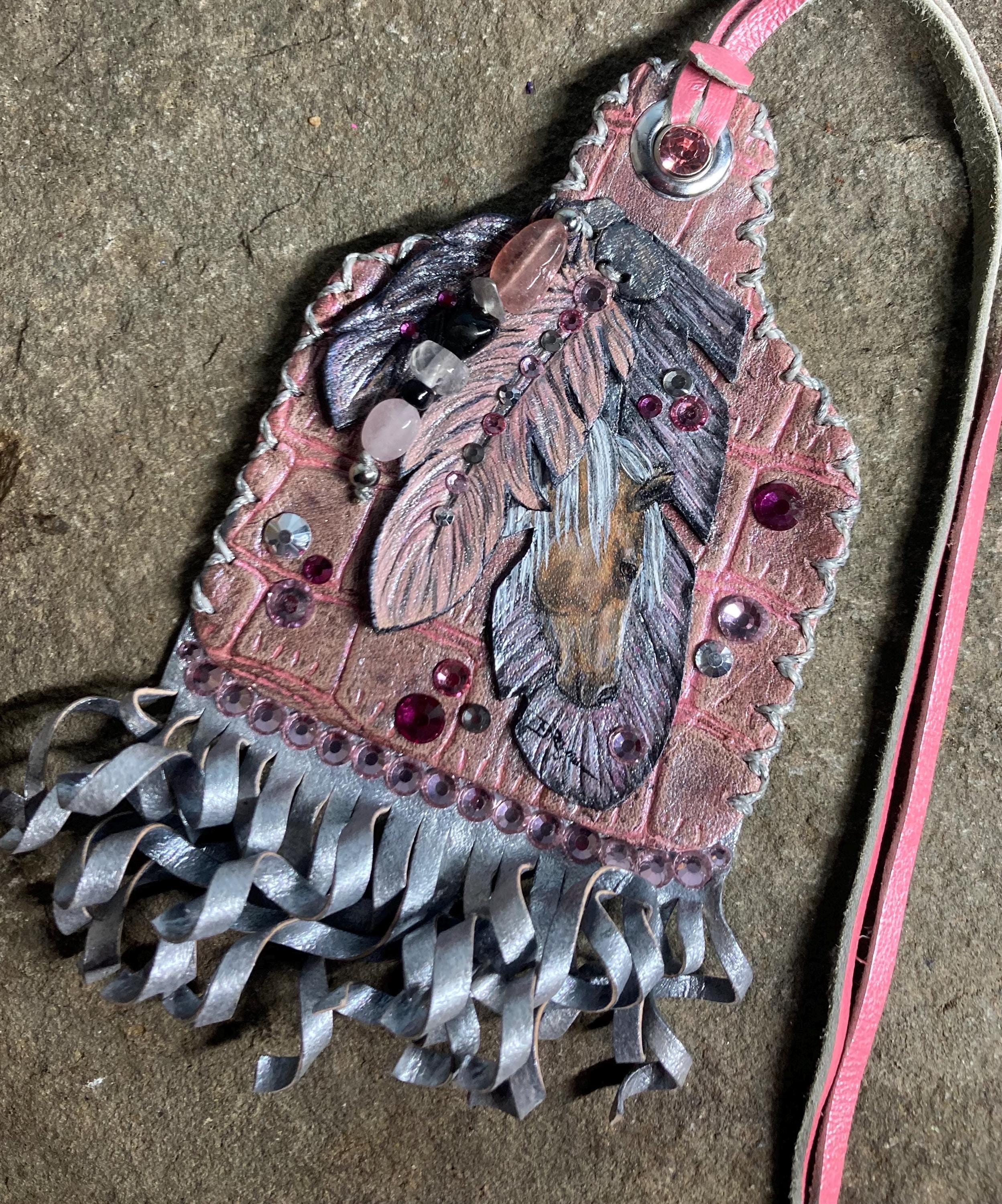 Western leather cow tag shaped charm with painted horse art | southwestern leather bag decor | tooled leather art charm | western ornament