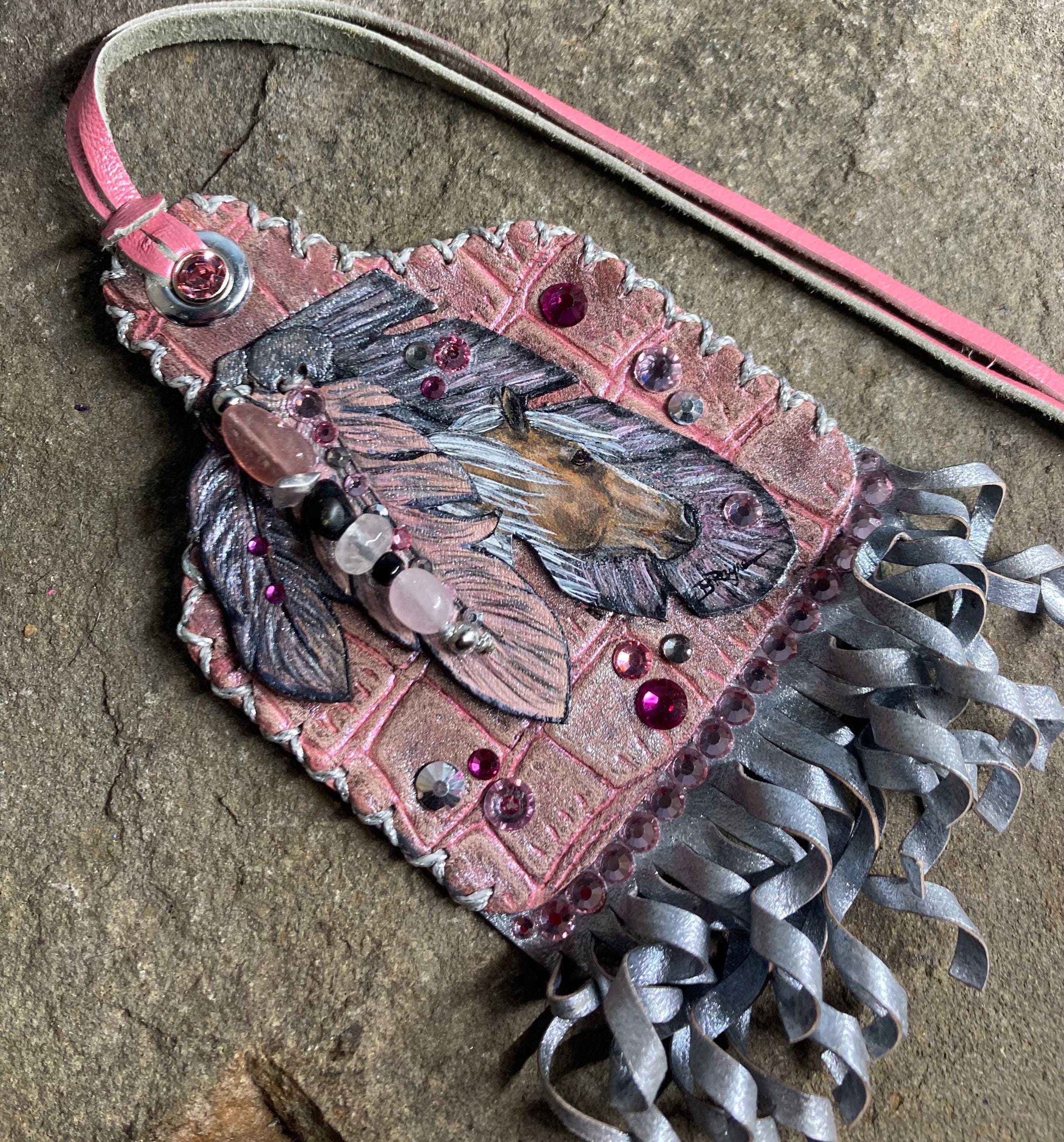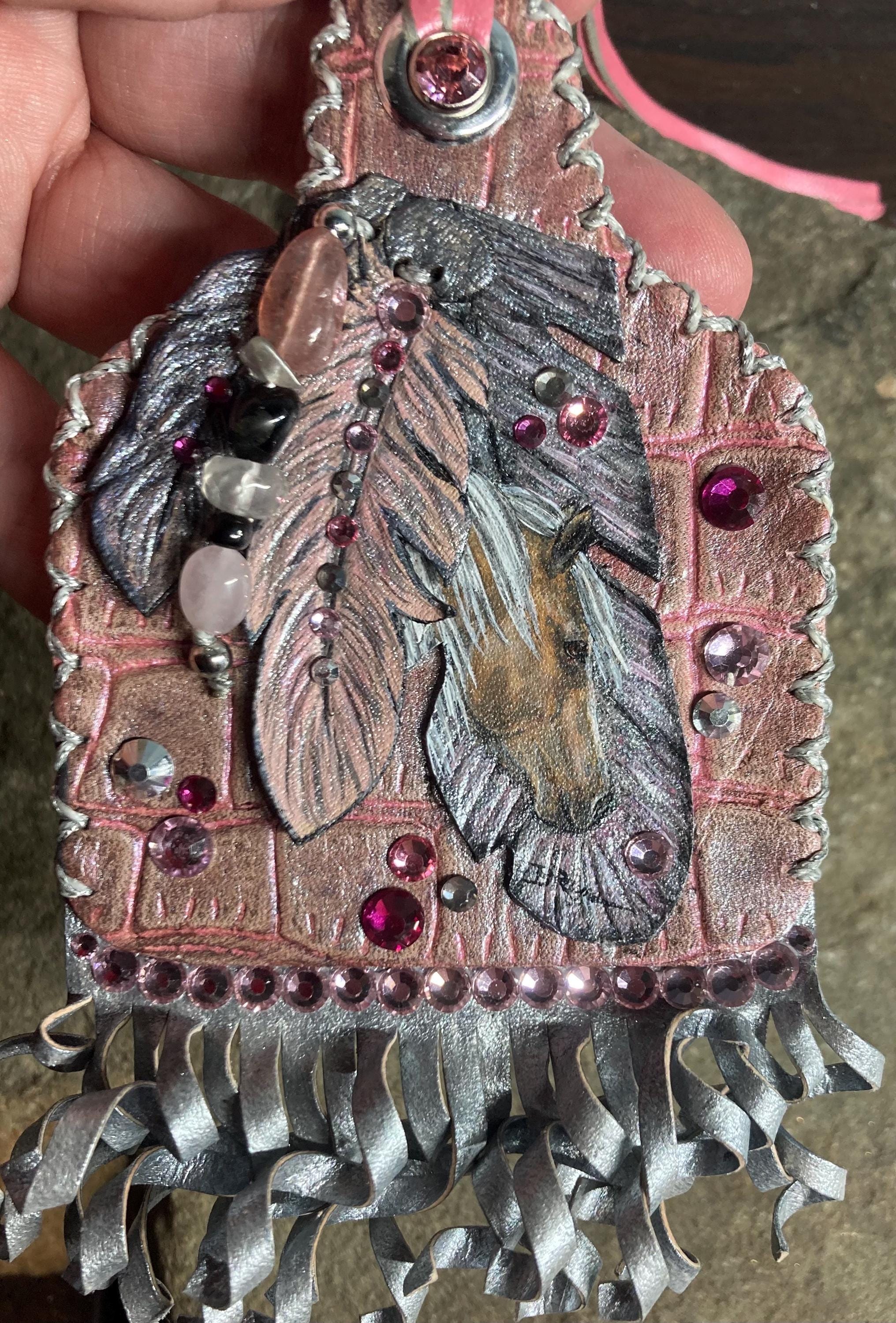 This one of a kind hand cut, tooled and painted horse art and painted leather feathers design genuine thick leather charm / ornament measures 5.5" x 3." and comes with a genuine leather cord to attach by tying. Silver back and curly leather fringe, sparkling glass rhinestones bling and real gemstones dangle embellishments. Would reflect lights beautifully hanging on Christmas tree!