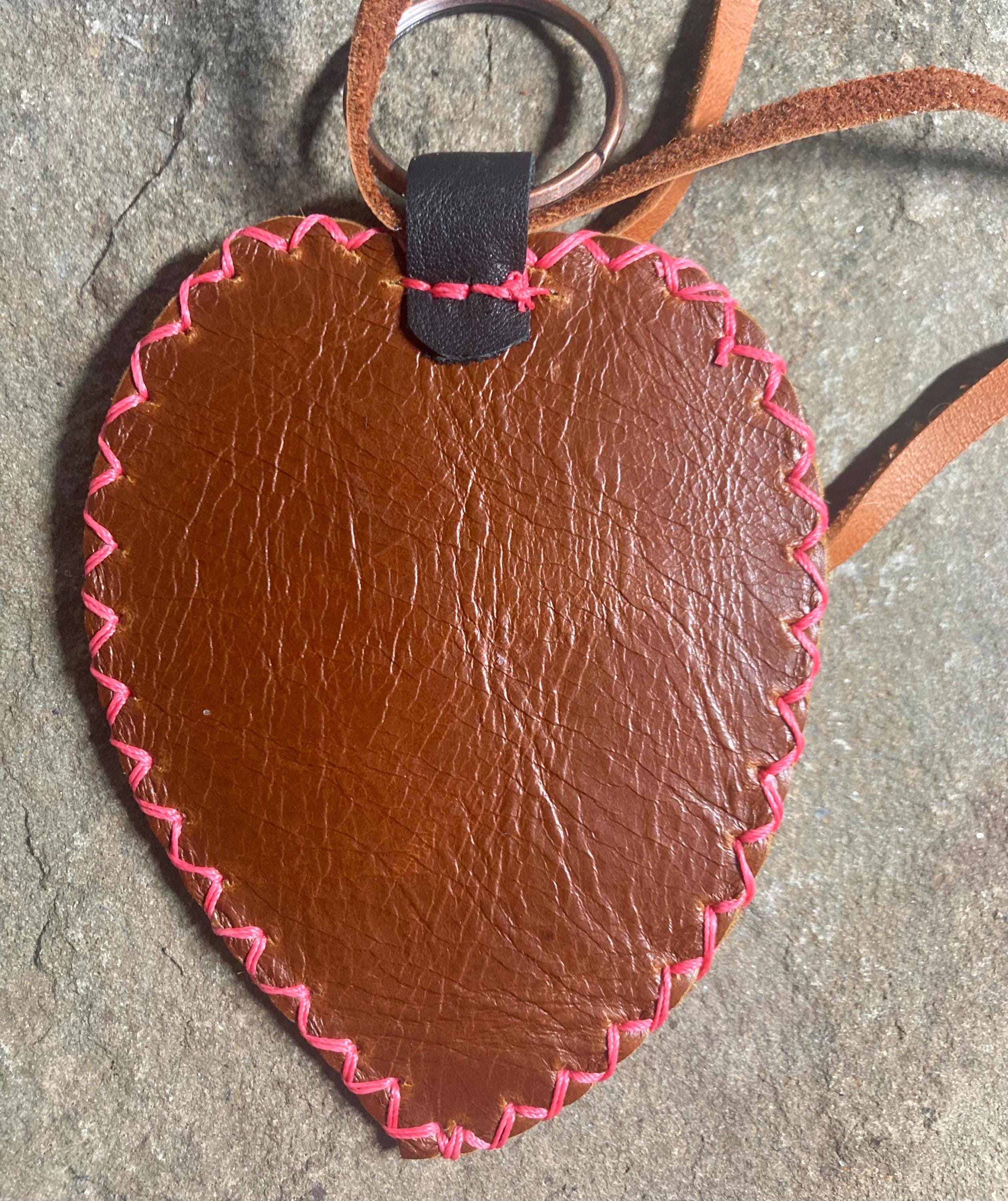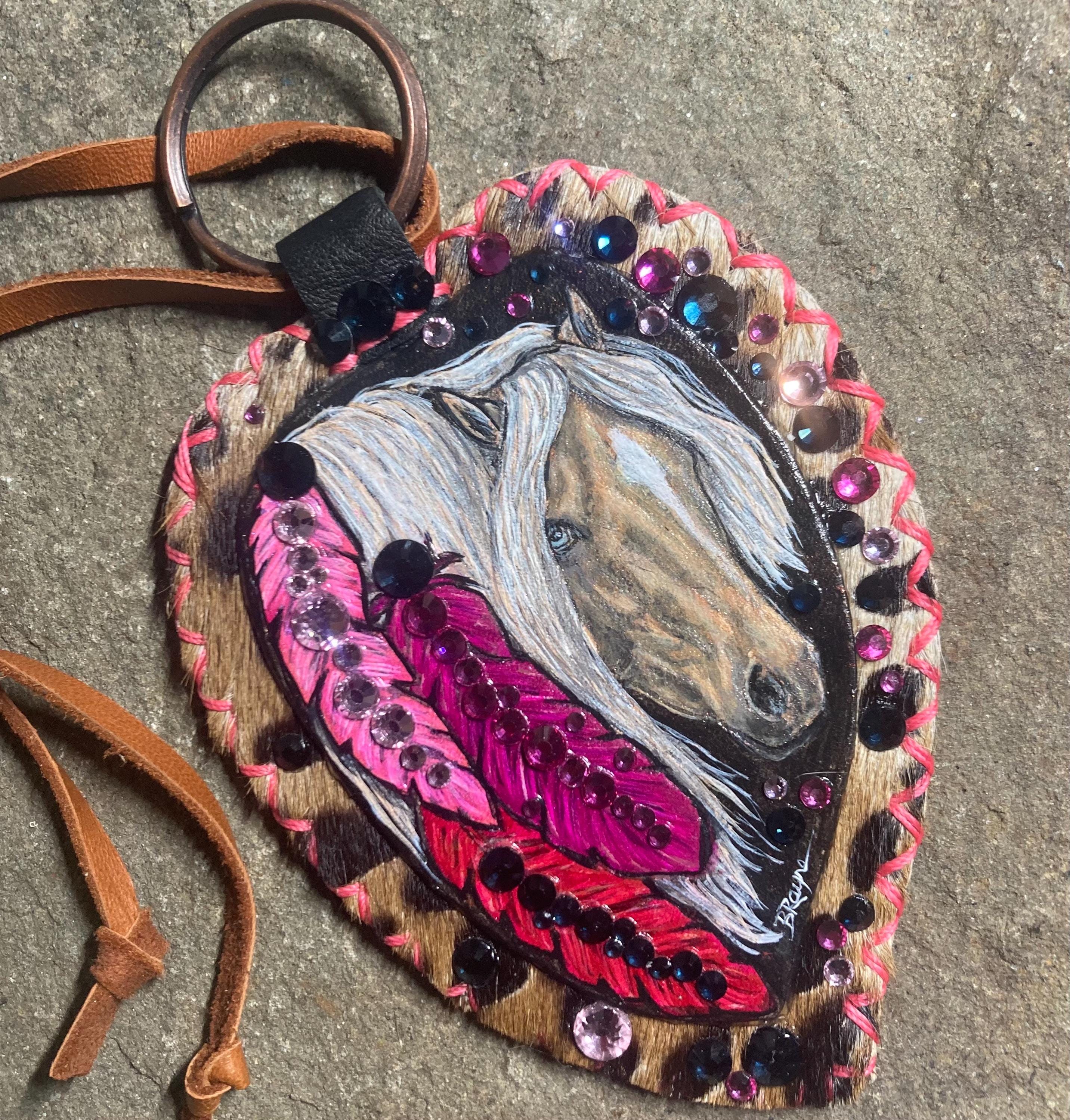 Ready to ship leather and rhinestones charm / key ring with painted and carved origional art of a horse and feathers, with a cheetah print leather border. Lots of sparkle from the glass rhinestones, comes as pictured with key ring and swivel snap and sturdy deerhide lace. Measures 4” x 3”