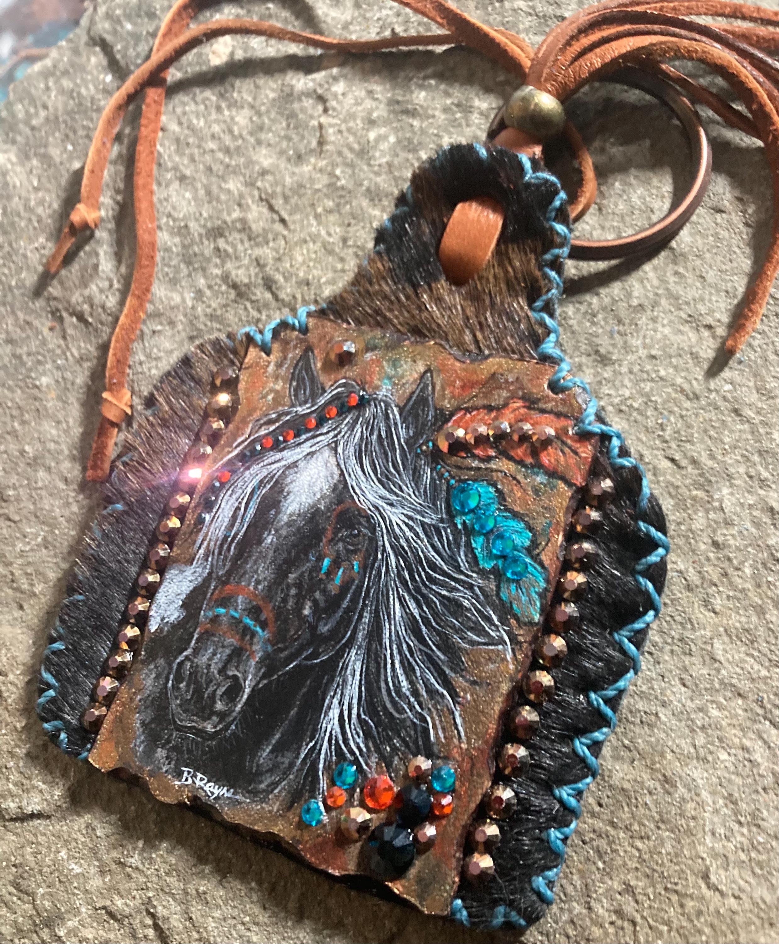 Ready to ship leather and rhinestones charm / key ring with painted origional art of a Native American Indian inspired horse and feathers, with a hair on hide leather border. Lots of sparkle from the glass rhinestones, comes as pictured with key ring and sturdy deerhide lace with fringe. Measures 4” x 3”