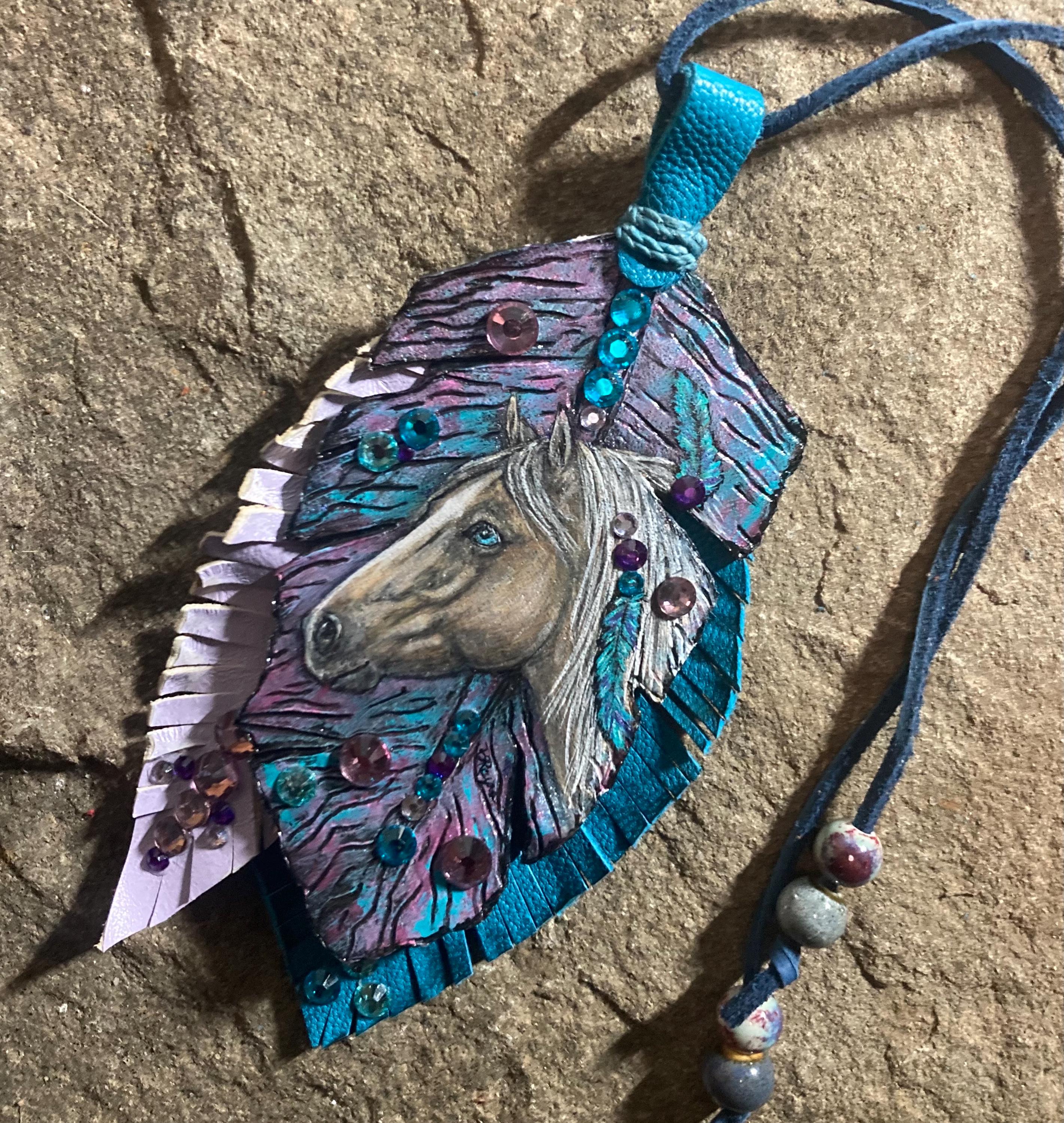 Custom made to order in your chosen colors, embellishments, and style with painted origional art of your horse genuine leather hand cut, painted and pyrography heat embellished carved feather attached to colorful stacked leather feathers and embellished with glass rhinestones and mix of glass, metal, ceramic, and gemstone beads. Measures 5” x 2.5”.