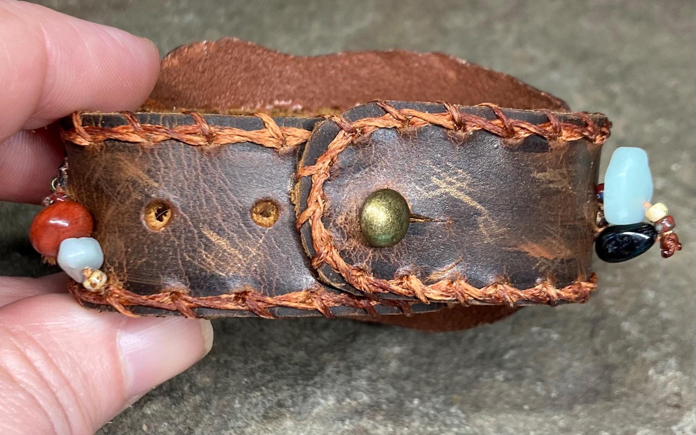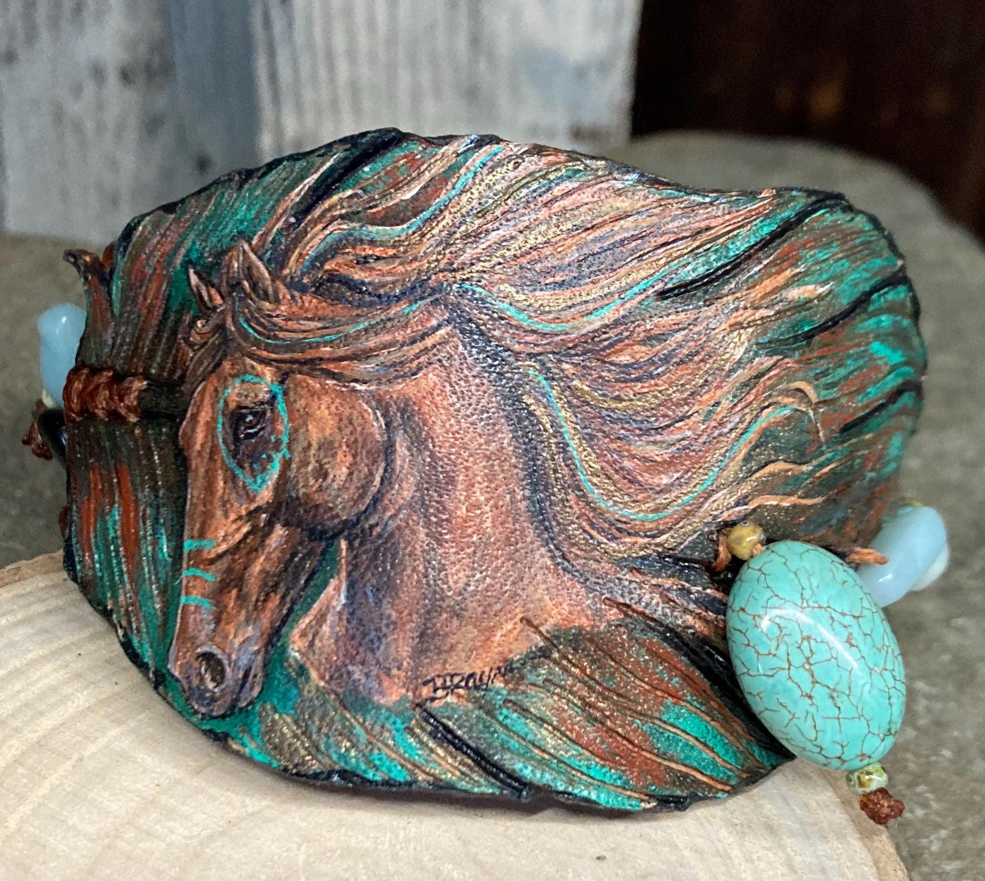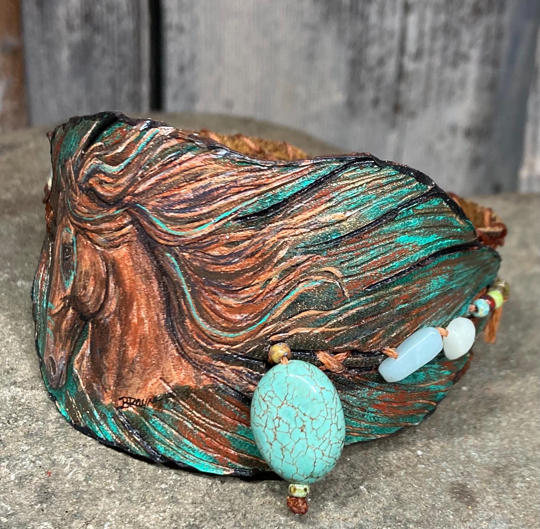 Rustic natural gemstones bling and genuine leather cowgirl bracelet with original acrylic fine art of a horse on a leather feather with heat carved details attached to a distressed oil tanned 1” genuine leather band. At widest point almost 2” wide. Closes with Chicago screw that is made to move easily to fit 6 1/2”, 7”, 7 1/2”, 8”. Back is soft suede side leather, all hand stitched.