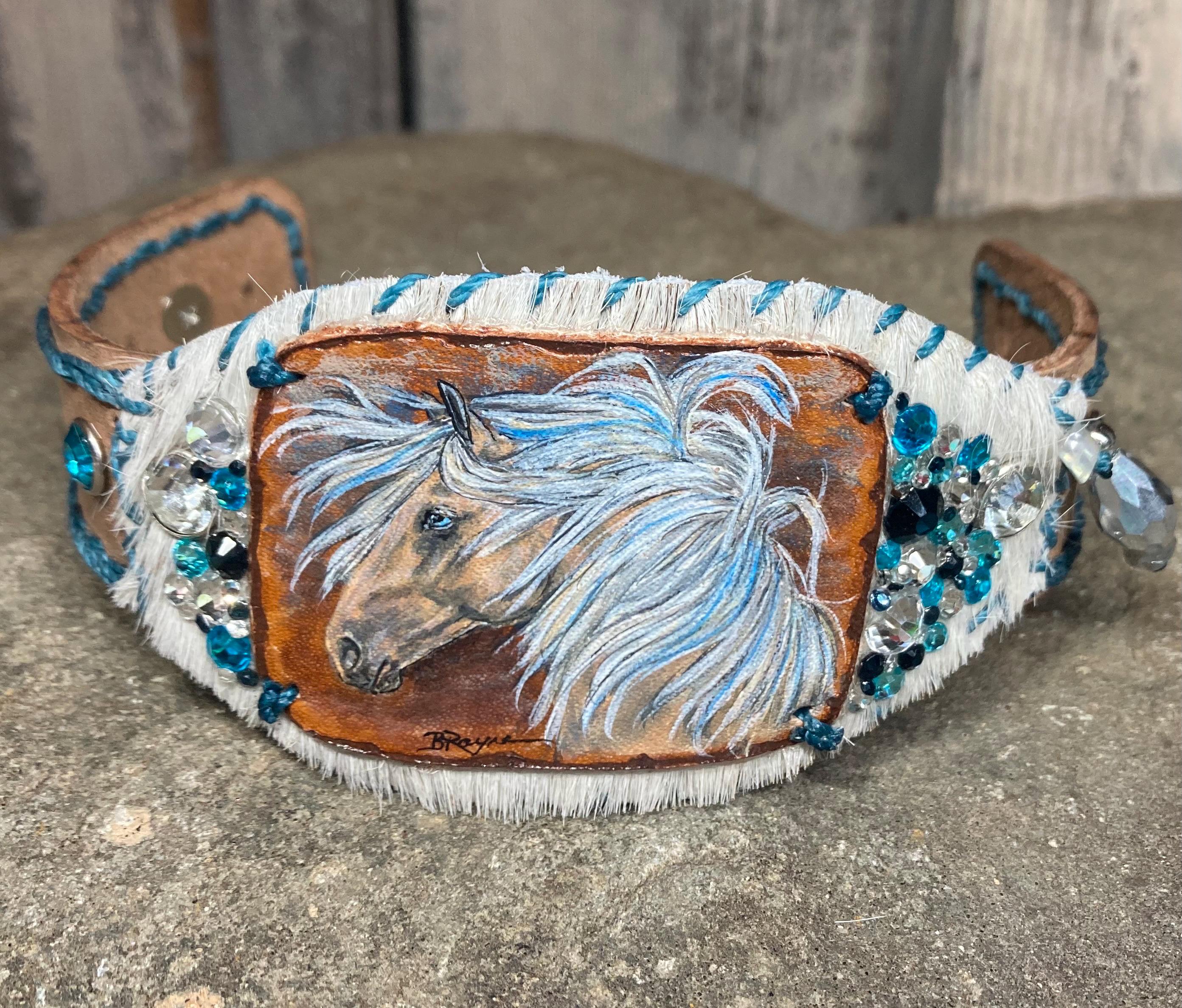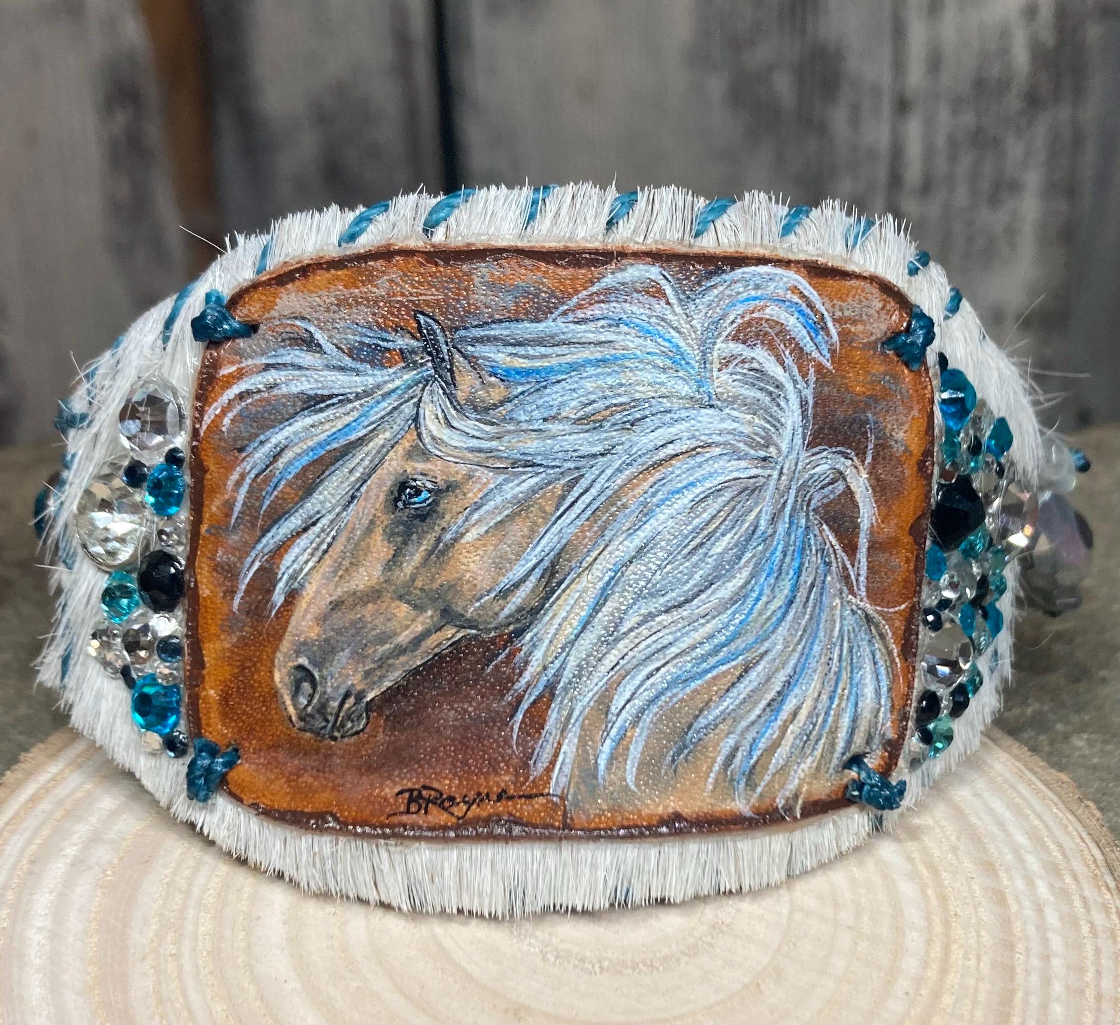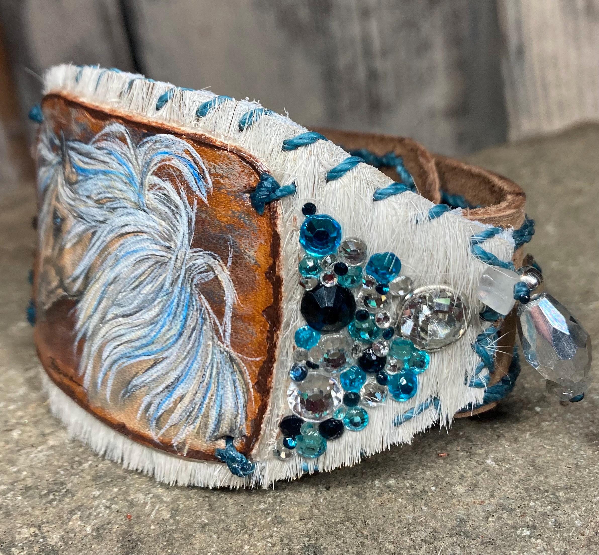 Statement Piece wide genuine leather cowgirl bracelet with original acrylic fine art of a horse on leather attached to hair on hide leather background, sparkling glass rhinestones and beads embellishments and distressed 1” wide leather band. At widest point 2.” wide. Closes with Chicago screw that is made to move easily to fit 6 1/2”, 7”, 7 1/2”, 8”. Back is soft suede side leather, all hand stitched.