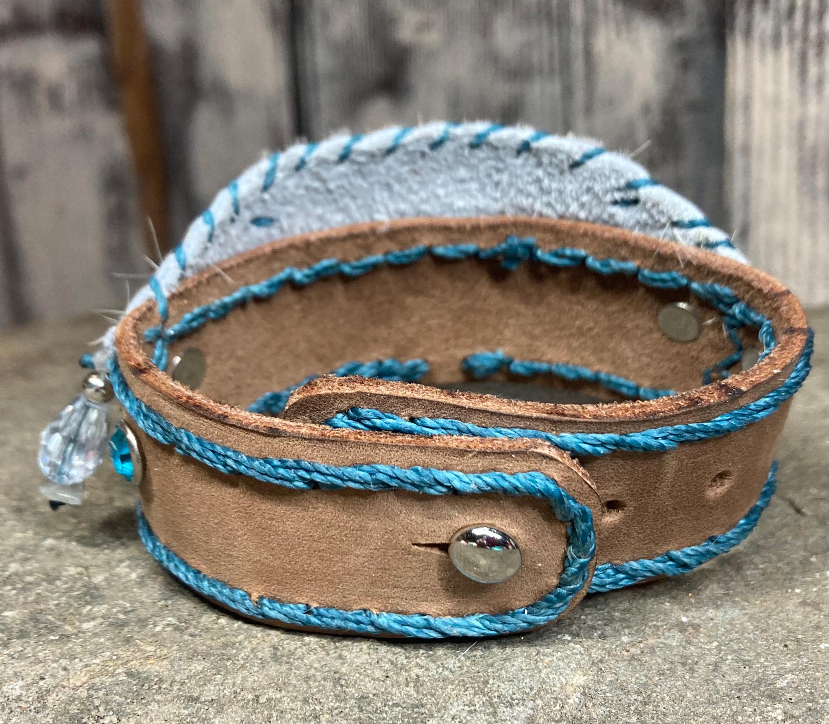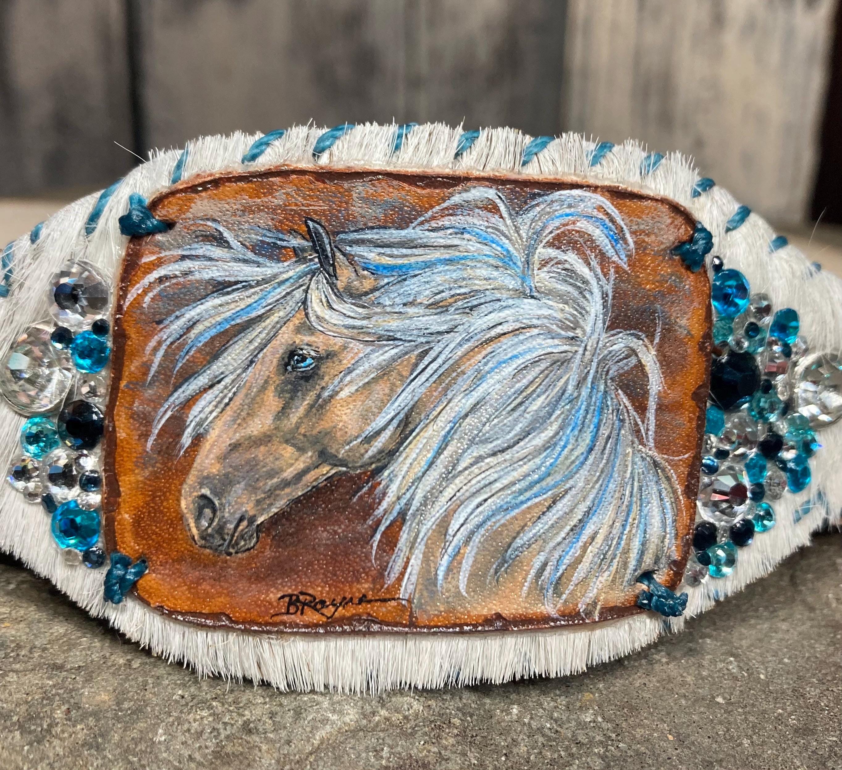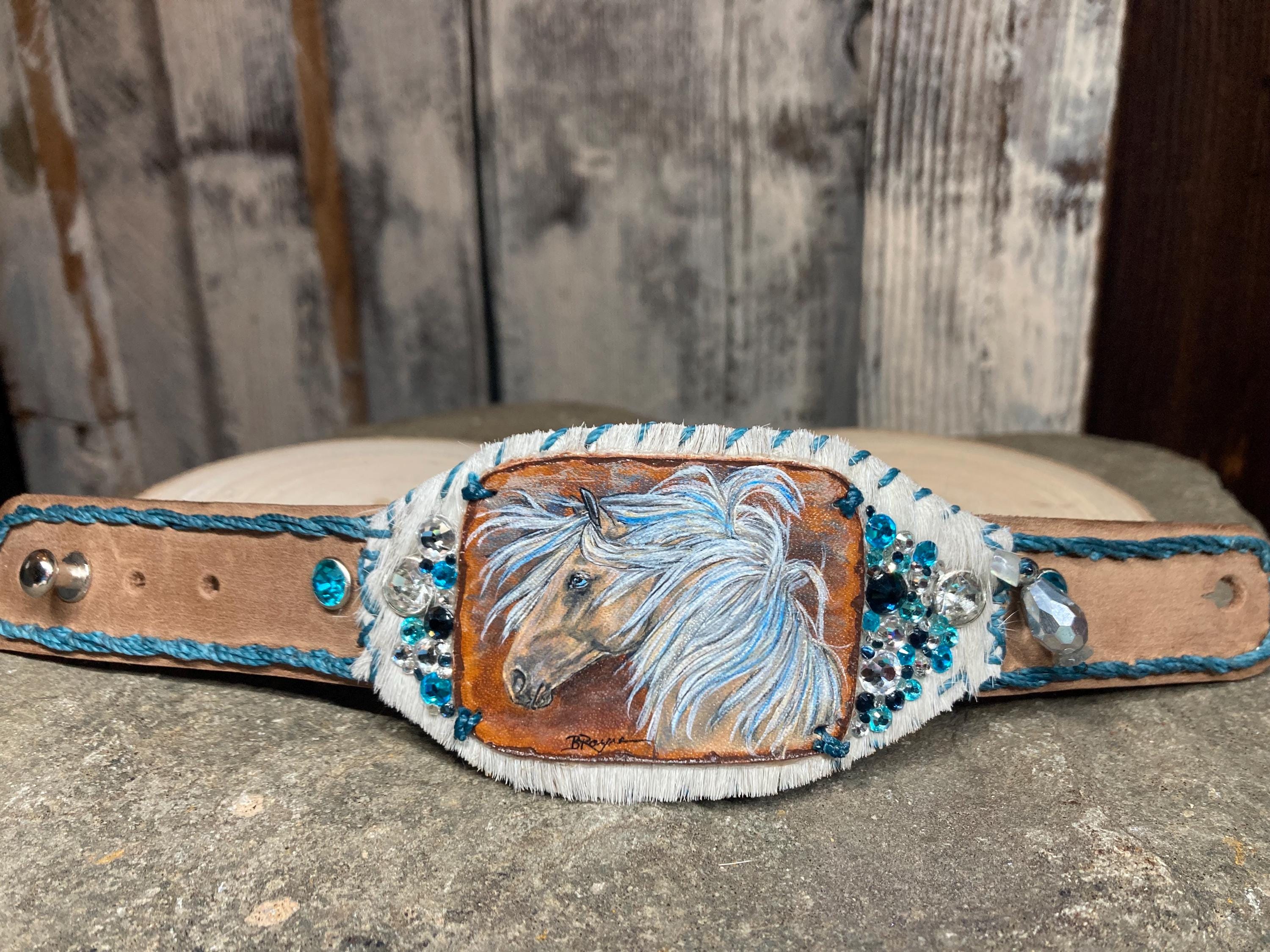 Statement Piece wide genuine leather cowgirl bracelet with original acrylic fine art of a horse on leather attached to hair on hide leather background, sparkling glass rhinestones and beads embellishments and distressed 1” wide leather band. At widest point 2.” wide. Closes with Chicago screw that is made to move easily to fit 6 1/2”, 7”, 7 1/2”, 8”. Back is soft suede side leather, all hand stitched.