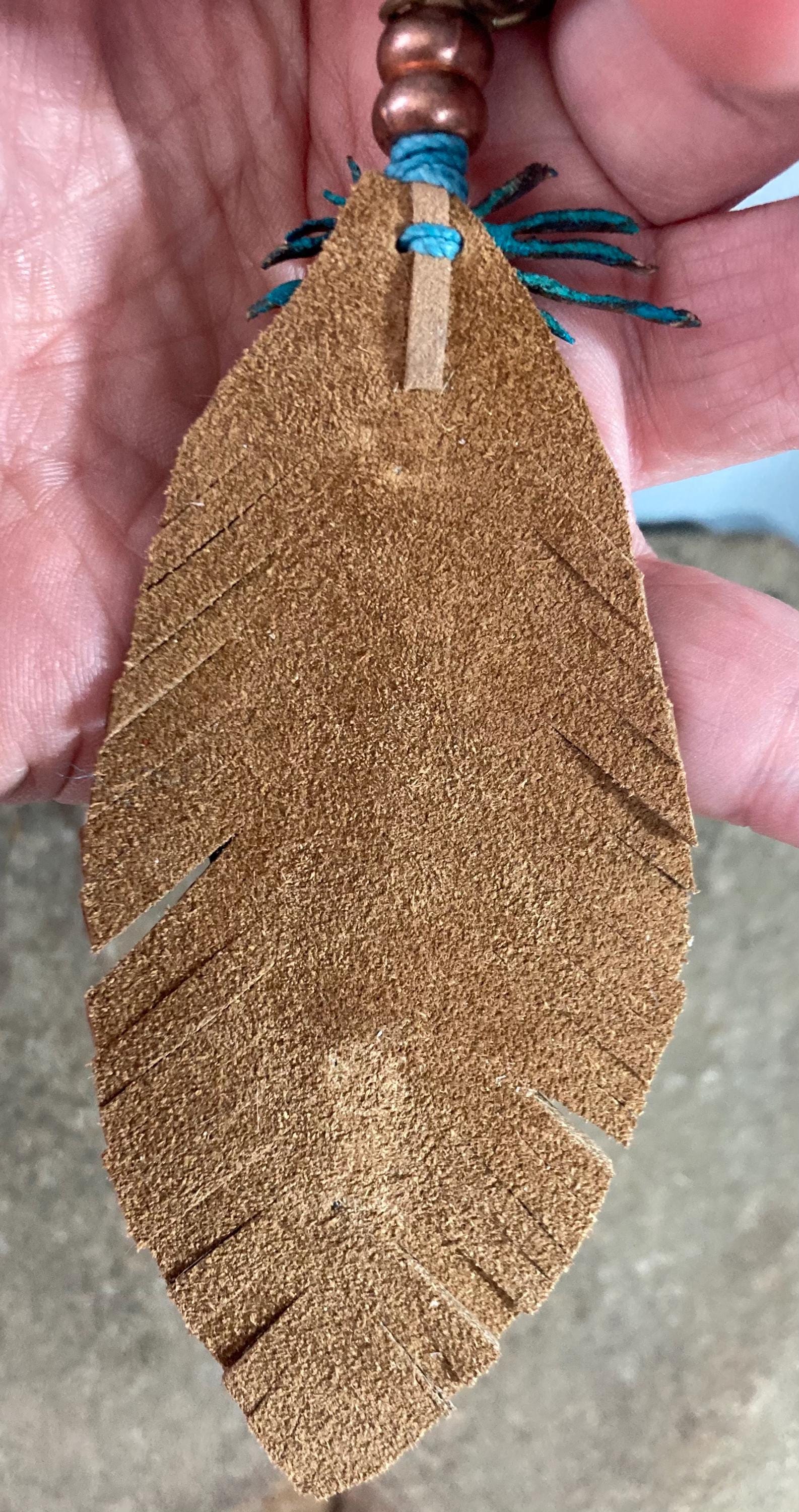 Ready to ship genuine leather hand cut, painted and pyrography heat embellished carved feather attached to colorful stacked leather feather and embellished with metal rivets and gemstone beads. Measures 5.5” long and includes key ring and swivel snap.