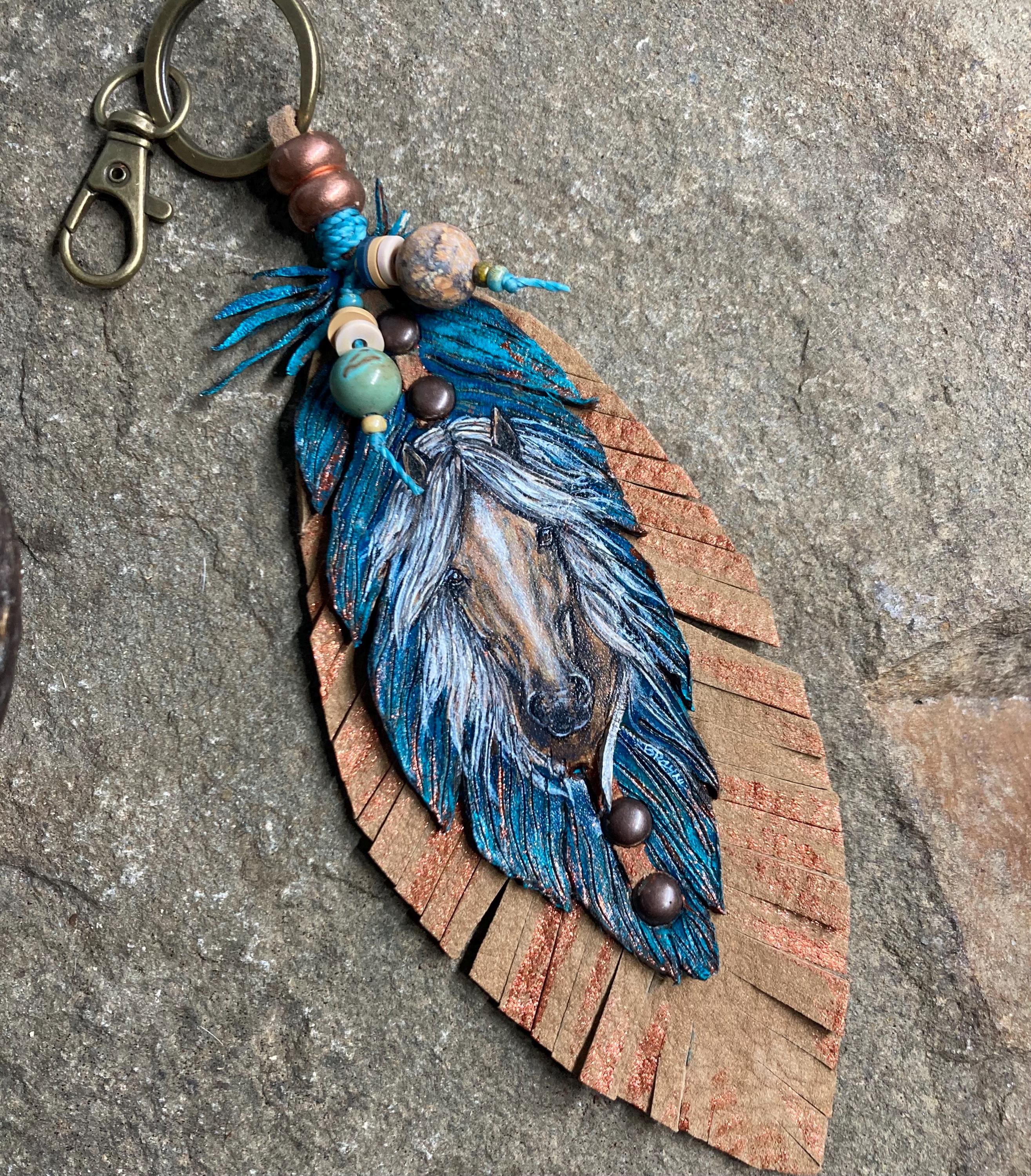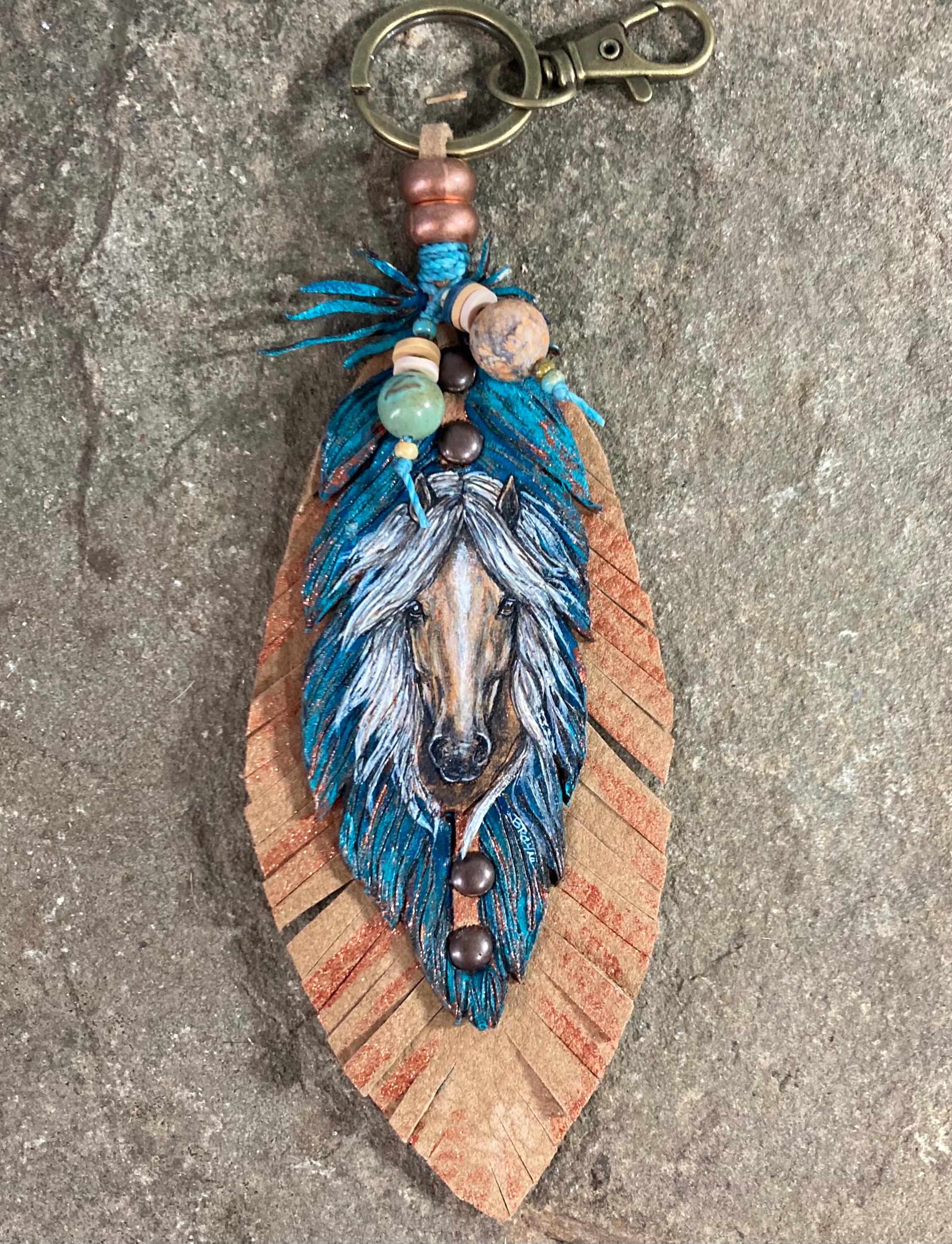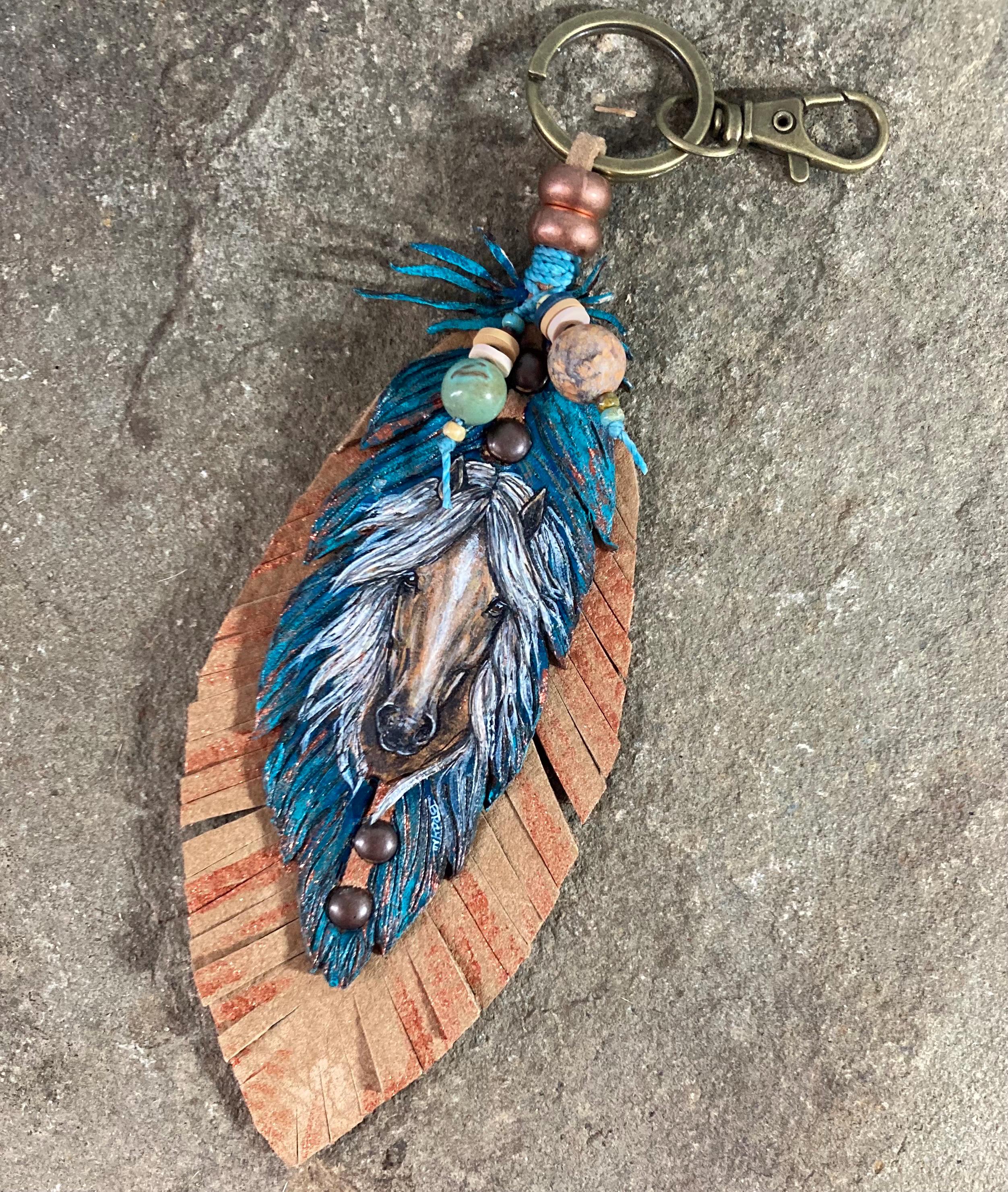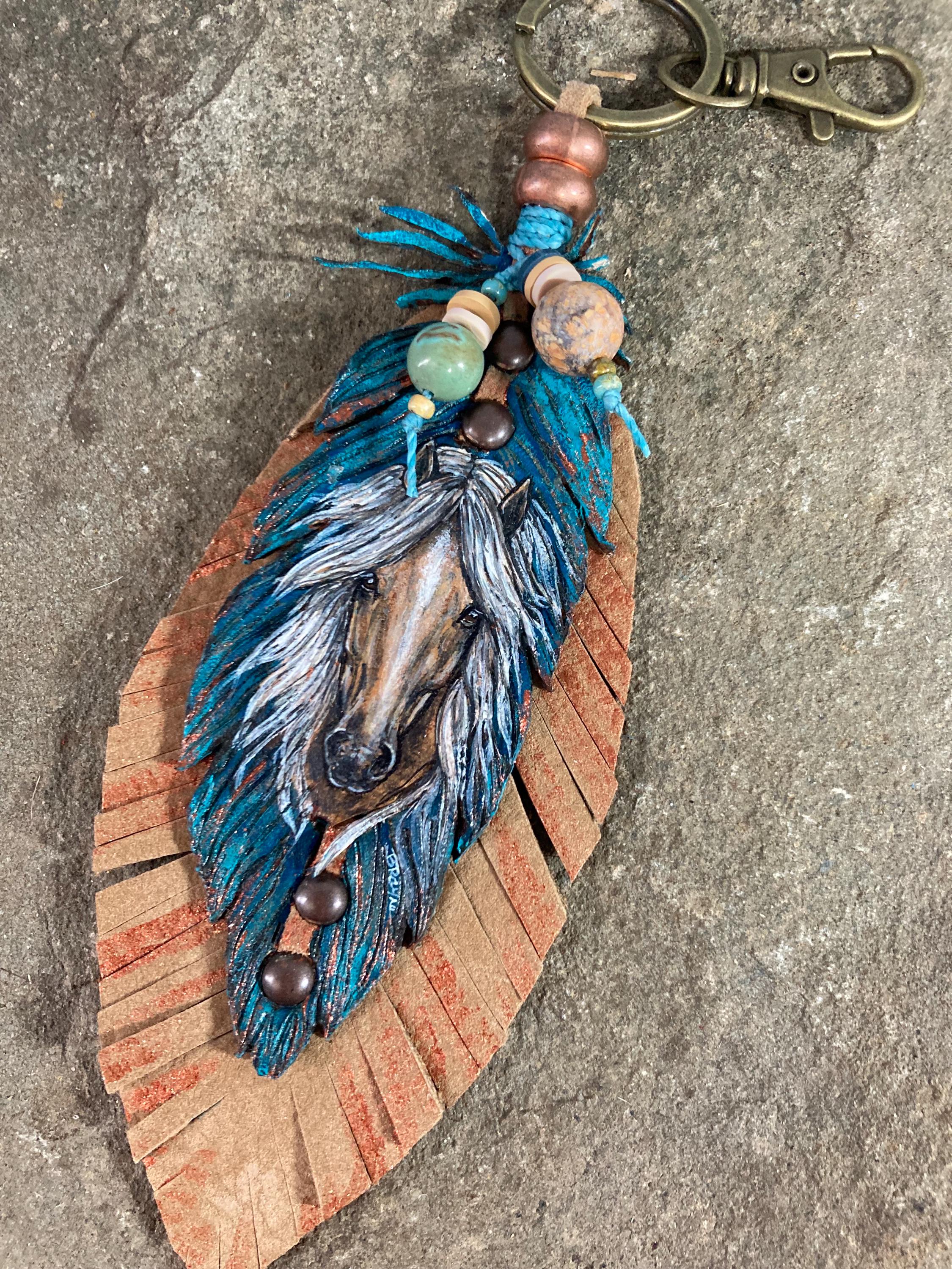 Hand-Painted Leather Feather Horse Charm: Western Southwestern Art Accessory